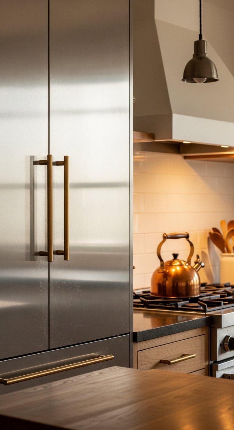 Incorporate metals like brushed brass, copper, or bronze for subtle warmth. Light fixtures, cabinet handles, or even a kettle in warm metal tones can lift the overall feel of the kitchen.Pair metallics with natural wood or soft-painted surfaces to avoid harsh contrasts. A small copper bowl on a wooden shelf or brass faucet against a creamy sink creates a layered, cozy aesthetic.Warm metallics reflect light softly, adding a glow to your kitchen. This small touch enhances the inviting atmosphere without overwhelming the farmhouse style.