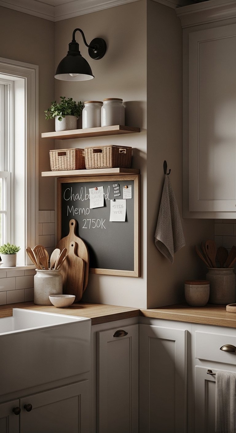 A small chalkboard or magnetic wall adds both function and charm to your farmhouse kitchen. It’s perfect for jotting down grocery lists, recipes, or family messages.Use a wooden frame to keep the look warm and rustic. You can also pair it with small hanging baskets or shelves for extra storage. This adds personality while keeping the kitchen practical.The wall becomes an interactive feature that feels lived-in, making the space more personal and engaging. Guests and family members will naturally feel drawn to it.