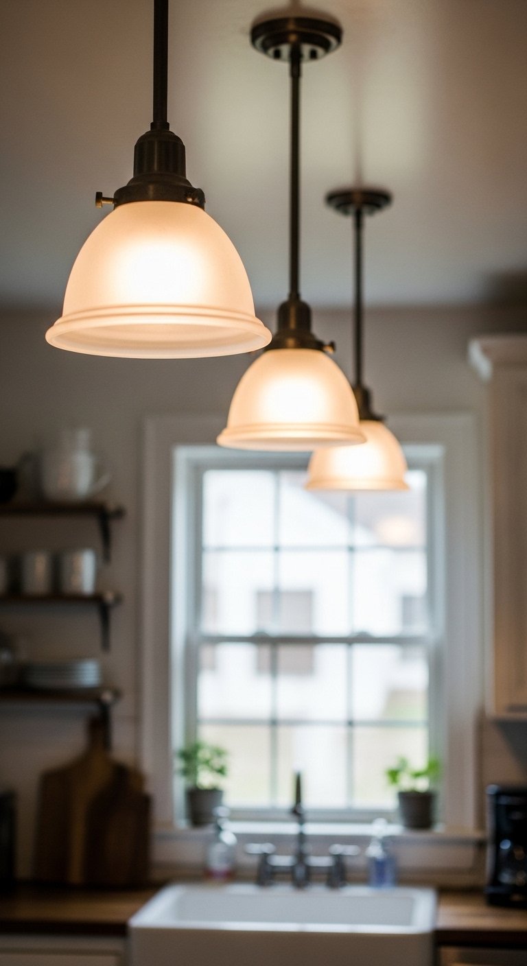 Vintage lighting brings history and warmth to a modern farmhouse kitchen. Look for pendants or sconces with aged metal, frosted glass, or subtle patina.Place them above islands, breakfast nooks, or workspaces to create cozy focal points. The glow of soft, warm bulbs highlights textures and enhances the overall inviting feel.Even one vintage fixture can transform a space, creating a layered, collected look. This approach ties together old and new elements, reinforcing the authentic farmhouse aesthetic.