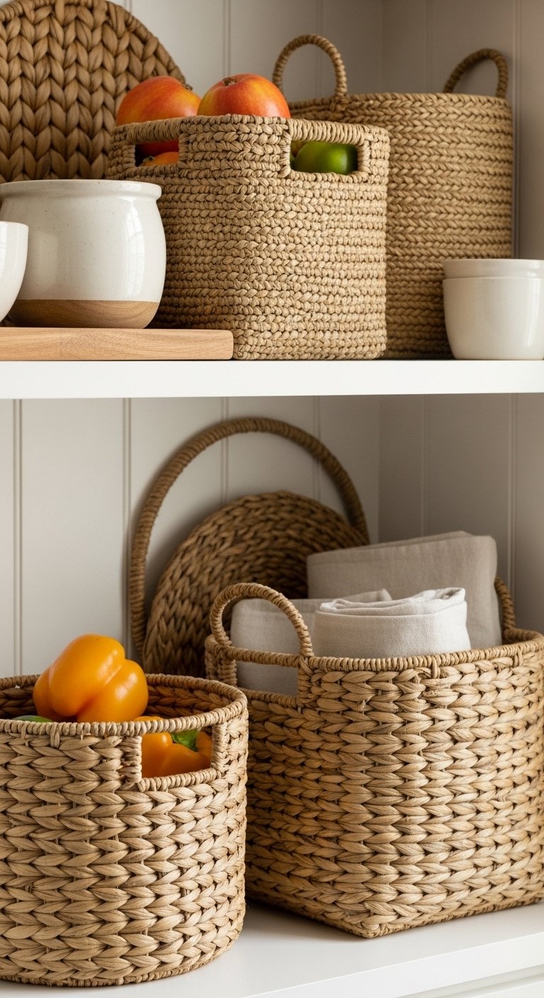 Woven baskets are perfect for functional storage while adding visual warmth. Use them to hold fruits, vegetables, linens, or small kitchen tools.Mix sizes and materials—like seagrass, wicker, or rattan—for a layered, natural look. Place them on open shelves or under counters to keep essentials accessible but stylish.These baskets create texture and softness in spaces that can otherwise feel rigid. They are practical and decorative, making your kitchen feel thoughtfully curated and cozy.