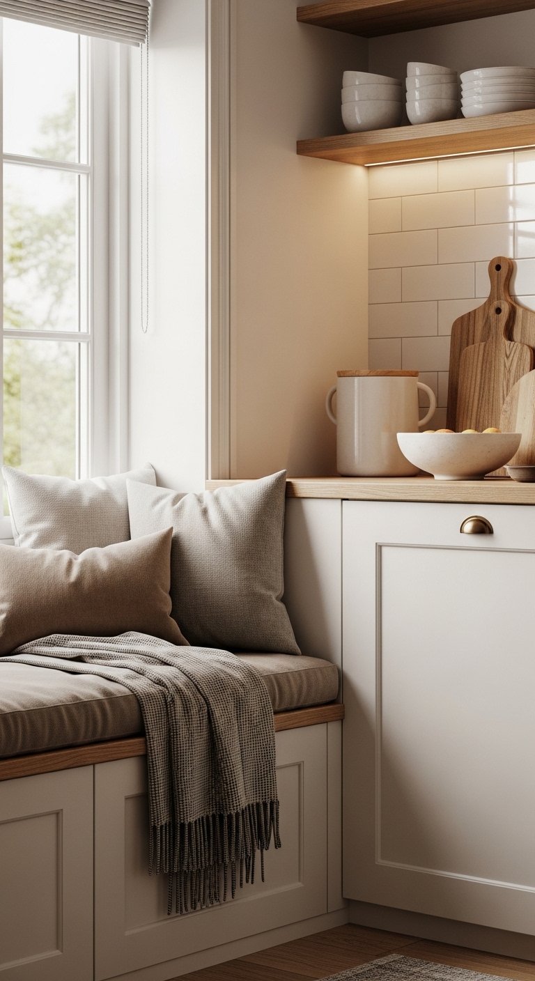 If space allows, a small bench or window seat in your kitchen can become a charming retreat. Add soft cushions and a throw to create a comfortable nook for reading or sipping coffee.Place it near a sunny window to maximize natural light. Wooden finishes or upholstered cushions in neutral tones reinforce the warm farmhouse feel.This tiny corner adds personality and encourages people to linger. It transforms the kitchen from a purely functional space into a place where warmth, comfort, and connection naturally happen.
