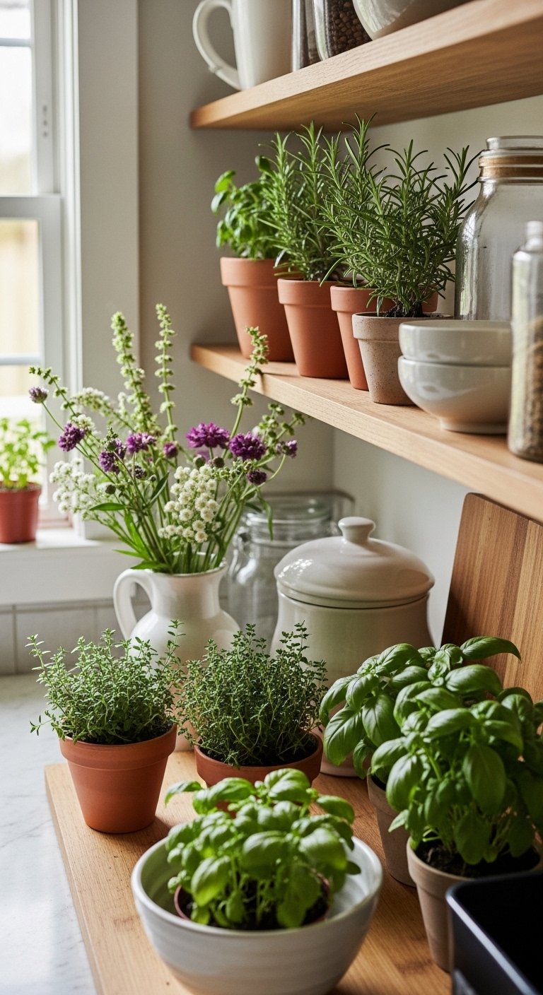 Adding a mix of fresh herbs and seasonal flowers creates a farmhouse kitchen that feels alive and inviting. Place small potted herbs like basil, rosemary, or thyme on windowsills, and complement them with a vase of fresh flowers on the counter or dining table.Mix textures and heights: use terracotta pots for herbs, a ceramic vase for flowers, and even a small woven basket to hold extras. This combination brings soft greenery, natural colors, and subtle fragrance into the kitchen.It’s a simple yet powerful way to make the space feel personal and cozy. The layers of green leaves, delicate blooms, and earthy containers evoke a lived-in charm that’s quintessentially farmhouse.