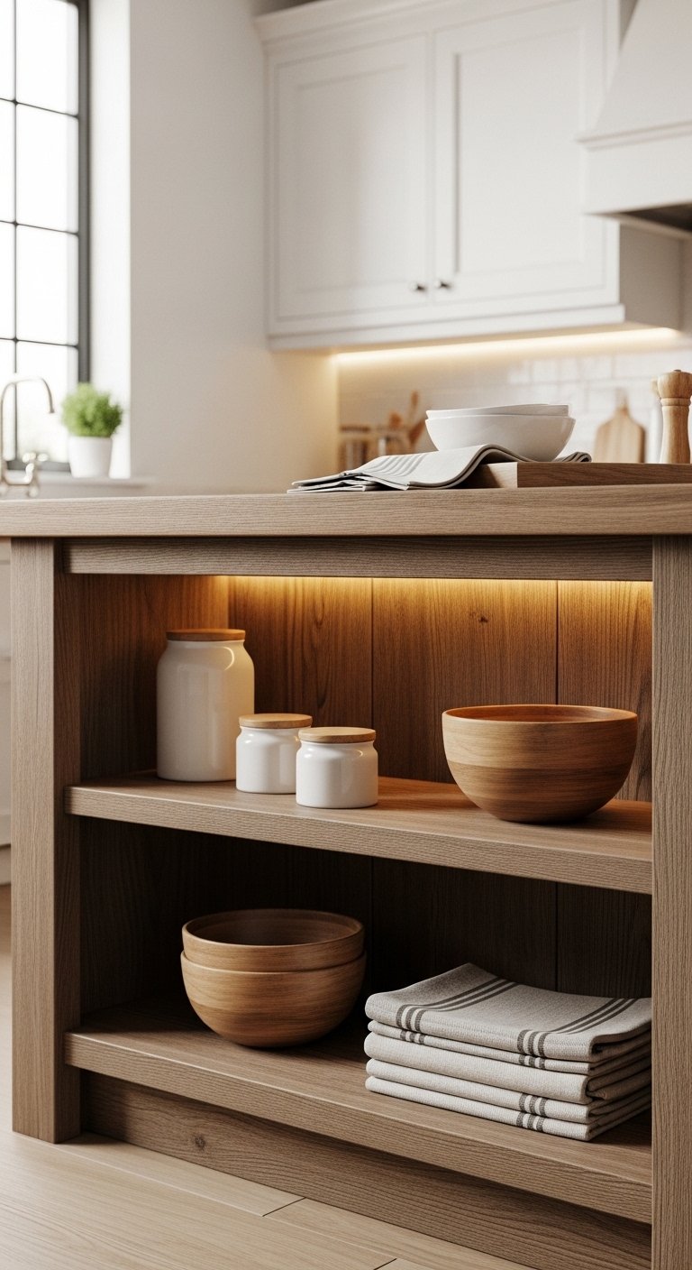 A wooden kitchen island becomes both a practical workspace and a visual centerpiece. Choose one with open shelves or cubbies to display wooden bowls, ceramic jars, or neatly stacked linens.Opt for a slightly distressed finish to add warmth and character. Pair it with a soft-toned countertop or butcher block for contrast. Add a couple of comfortable stools to encourage gathering and casual conversation.This setup turns a simple island into a hub of function and style. It creates a warm, inviting focal point where cooking, chatting, and cozy moments naturally come together.