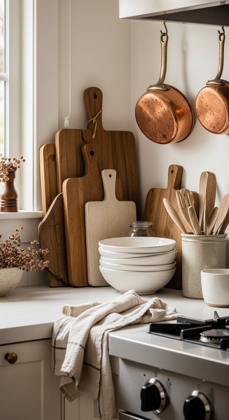 Turn daily-use items into charming décor to reinforce warmth. Stack wooden cutting boards of different sizes against a backsplash, hang copper pots on a rail, or display colorful ceramic mugs on hooks.Arrange items thoughtfully to balance function and visual appeal. Mix materials like wood, ceramic, and metal to create texture and depth. Even something as simple as neatly folded linen towels can add softness.This approach makes your kitchen feel authentic and lived-in. Every element tells a story and contributes to a farmhouse kitchen that feels warm, welcoming, and ready for everyday life.