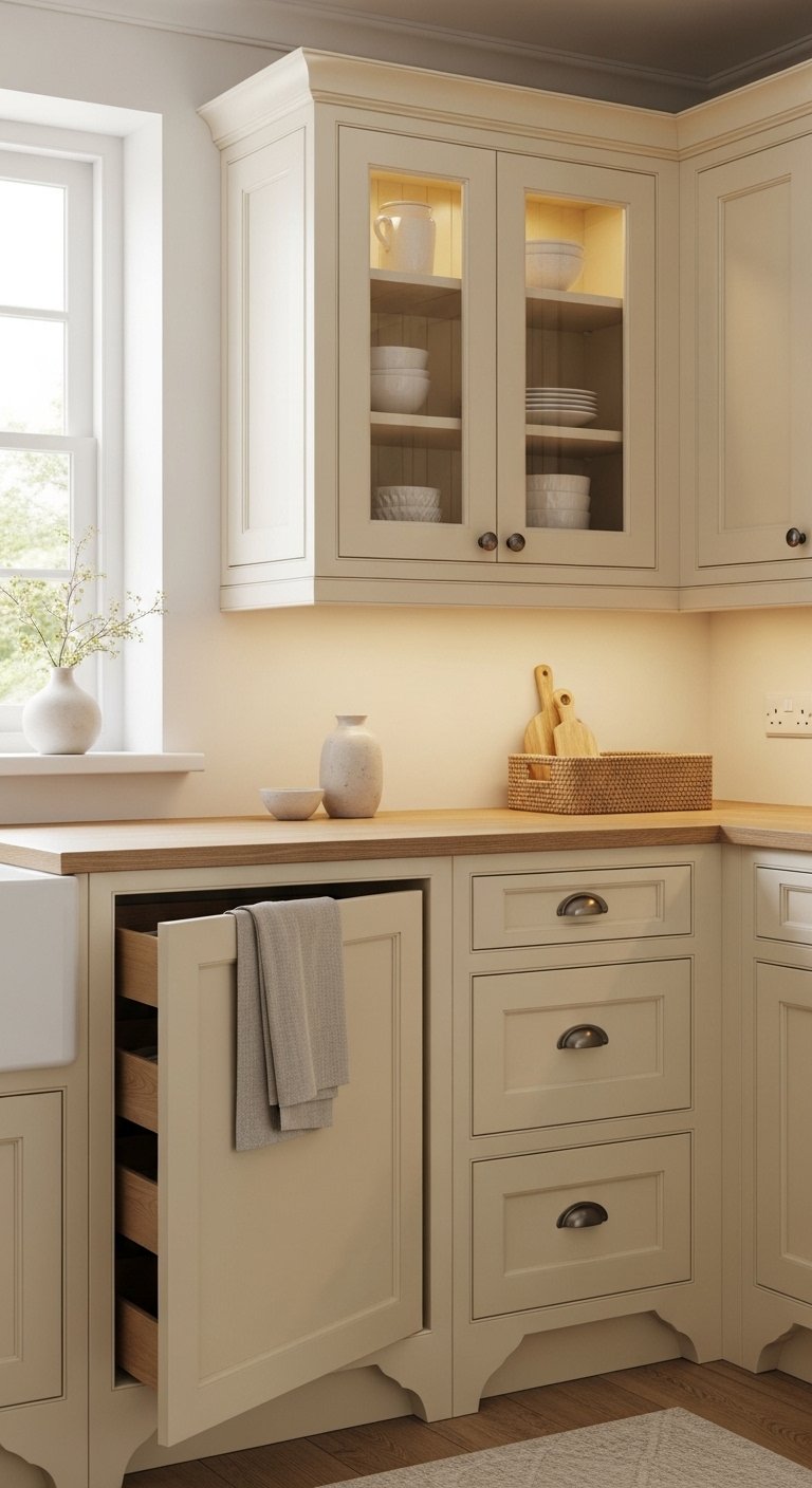 A farmhouse sink is more than just a functional piece. It becomes the visual heart of your kitchen. Choose a deep apron-front sink in white ceramic or matte stone to create a strong, inviting focal point.Pair it with a brushed brass or antique-style faucet to add warmth and character. The contrast between smooth ceramic and slightly aged metal brings a balanced look that feels both clean and cozy.You can enhance this area by placing a folded linen towel over the sink edge or adding a small wooden stool nearby. These details make the space feel thoughtful and lived-in, turning a simple sink into a charming farmhouse feature.