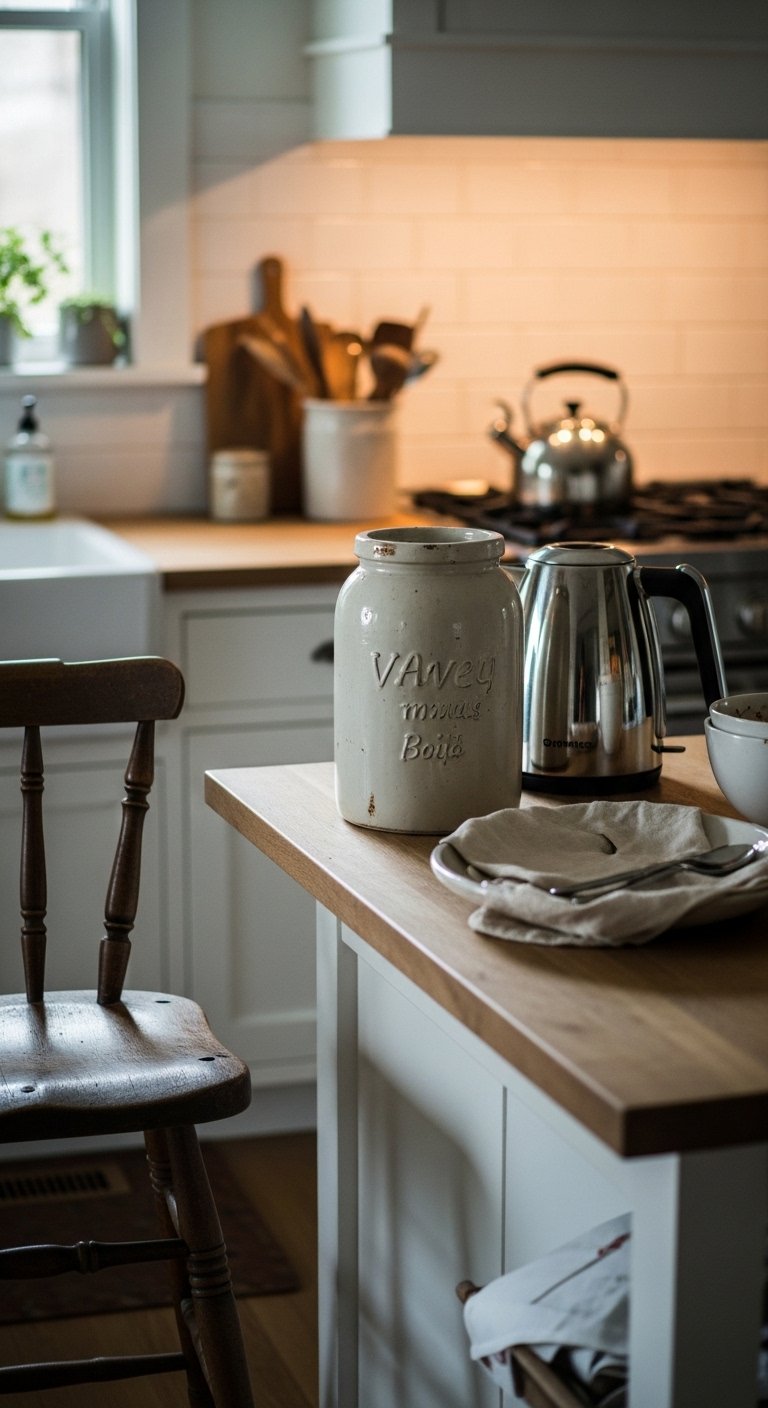 A true farmhouse kitchen does not look brand new. It feels collected over time. Mix vintage items with modern elements to create a balanced and interesting space.For example, pair sleek cabinets with an old wooden stool or display vintage jars next to modern appliances. This contrast adds personality and keeps your kitchen from feeling too styled.Look for items like antique trays, old scales, or weathered cutting boards. Even one or two vintage pieces can make a big difference. This mix creates a story in your kitchen and makes it feel unique to you.