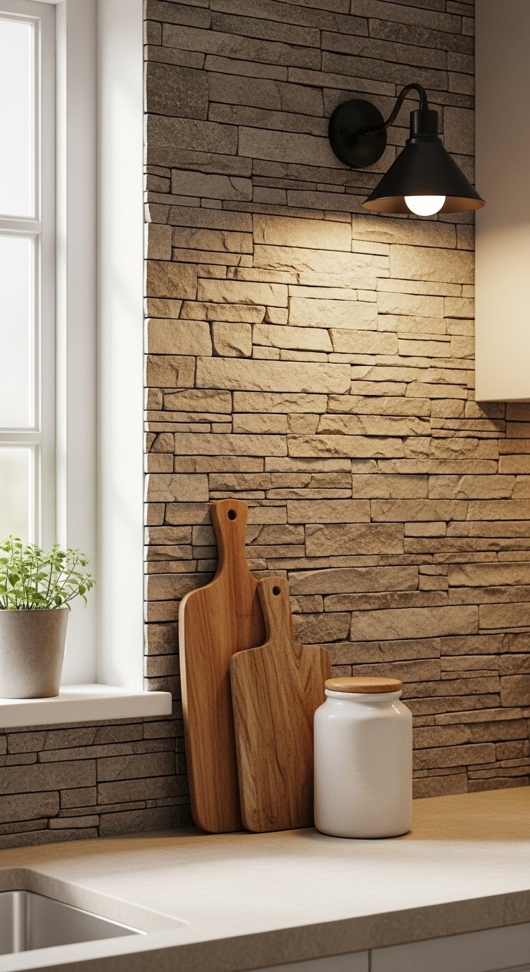 Adding natural materials like stone or brick can instantly warm up your kitchen. A small brick backsplash or a stone accent wall creates texture and depth without needing a full remodel.Choose soft, earthy tones that blend with your cabinets and countertops. These materials bring a sense of history and make the space feel grounded. Even a subtle stone detail behind the stove can become a beautiful focal point.This idea works especially well when paired with wood and warm lighting. The combination creates a rich, layered look that feels both strong and welcoming.