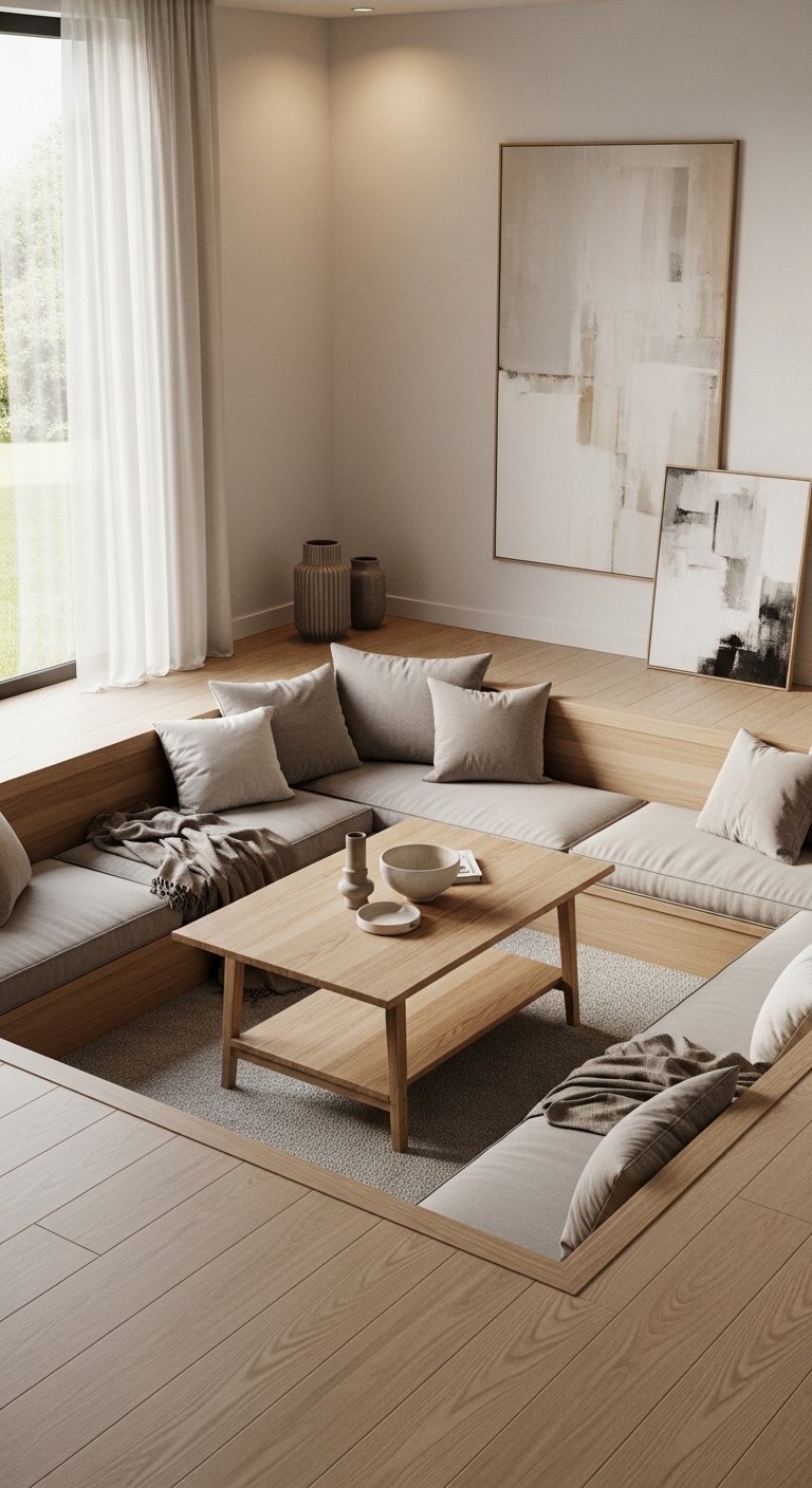 A sunken seating area adds instant architectural luxury to your living room. This design lowers the seating zone slightly below floor level, creating a cozy and private feel within a larger space. Use soft, plush cushions in neutral tones like warm beige or soft grey to keep the look inviting.Frame the area with wood or stone edges to define the space clearly. Add a central coffee table in marble or matte wood for balance. Soft recessed lighting around the edges enhances depth and highlights the layered structure.Keep surrounding décor minimal so the sunken space becomes the natural focal point. This layout works best in open-plan homes where you want to create zones without walls. It feels modern, calm, and thoughtfully designed.