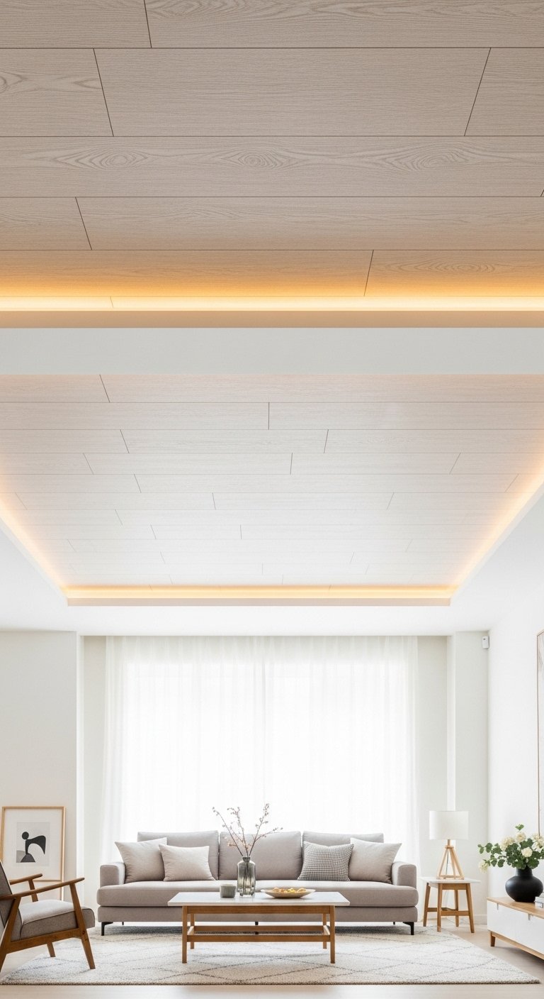 Most people forget the ceiling, but adding texture here can completely change your living room. Use wood panels, subtle beams, or even fabric-inspired finishes to create depth above.Choose light tones like soft oak or off-white to keep the room airy. Pair this with warm lighting such as recessed lights or a soft pendant to highlight the texture.A textured ceiling works best when the rest of the room stays simple. It adds interest without cluttering your walls or floors.This idea brings balance by using vertical space. It makes your room feel larger and more layered while keeping a calm and elegant atmosphere.