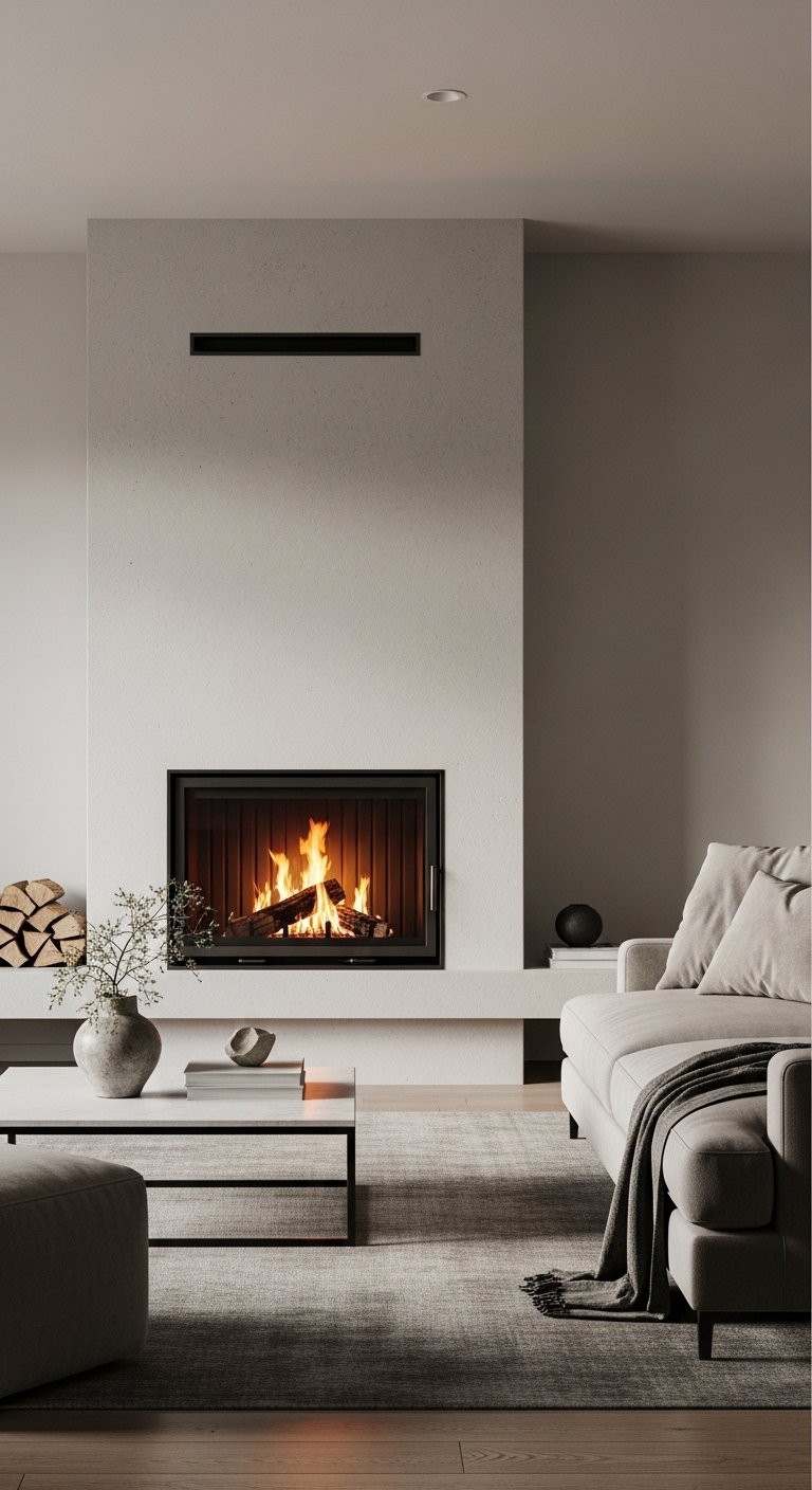 A sleek, modern fireplace adds warmth and a strong focal point. Choose a simple design with clean edges and neutral materials like stone or concrete.Keep the surrounding area uncluttered. A single piece of art or a few carefully chosen objects is enough. Let the fireplace stand out naturally.Use soft lighting to enhance the texture of the material. A low flame with a warm glow creates a relaxing and luxurious mood.This design works well in both small and large living rooms. It adds comfort while maintaining a modern and refined look.