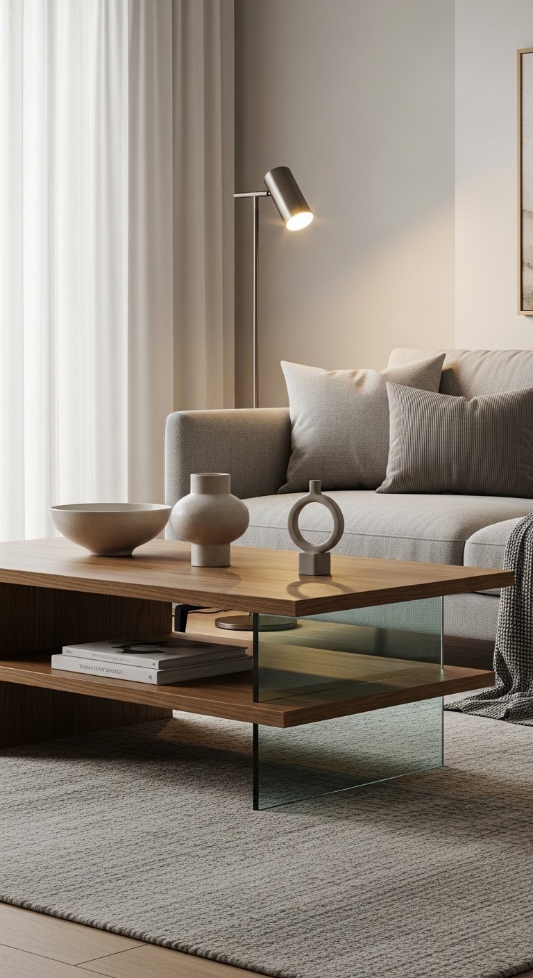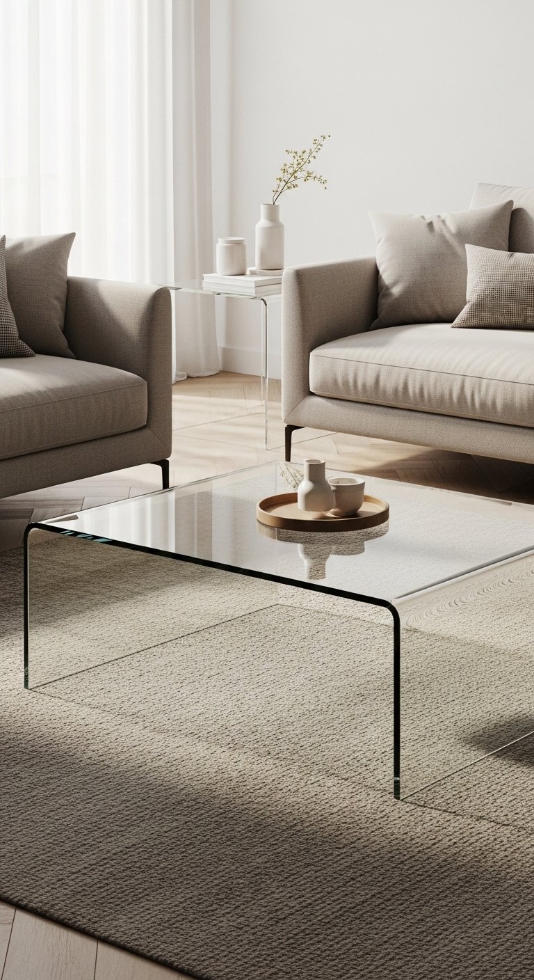 Glass adds lightness and elegance to any living room. Use glass coffee tables, side tables, or decorative pieces to reflect natural and artificial light.Choose clear or slightly tinted glass to keep the look soft and modern. Pair it with materials like wood or metal to avoid a cold feeling.Place glass pieces near windows or light sources to maximize their effect. This creates a bright and open atmosphere.Glass also helps small spaces feel larger. It reduces visual weight while still adding style and function.