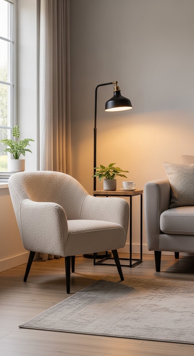 Accent chairs give you a chance to add something bold without overwhelming the room. Choose a unique shape or fabric that stands out from your sofa.Think of rich textures like velvet, boucle, or leather in deep tones or soft neutrals. Place the chair near a window or next to a floor lamp to create a cozy corner.Keep the rest of the room balanced so the chair feels intentional. Add a small side table or a soft throw to complete the look.This idea works because it adds character while keeping the overall design clean and controlled.
