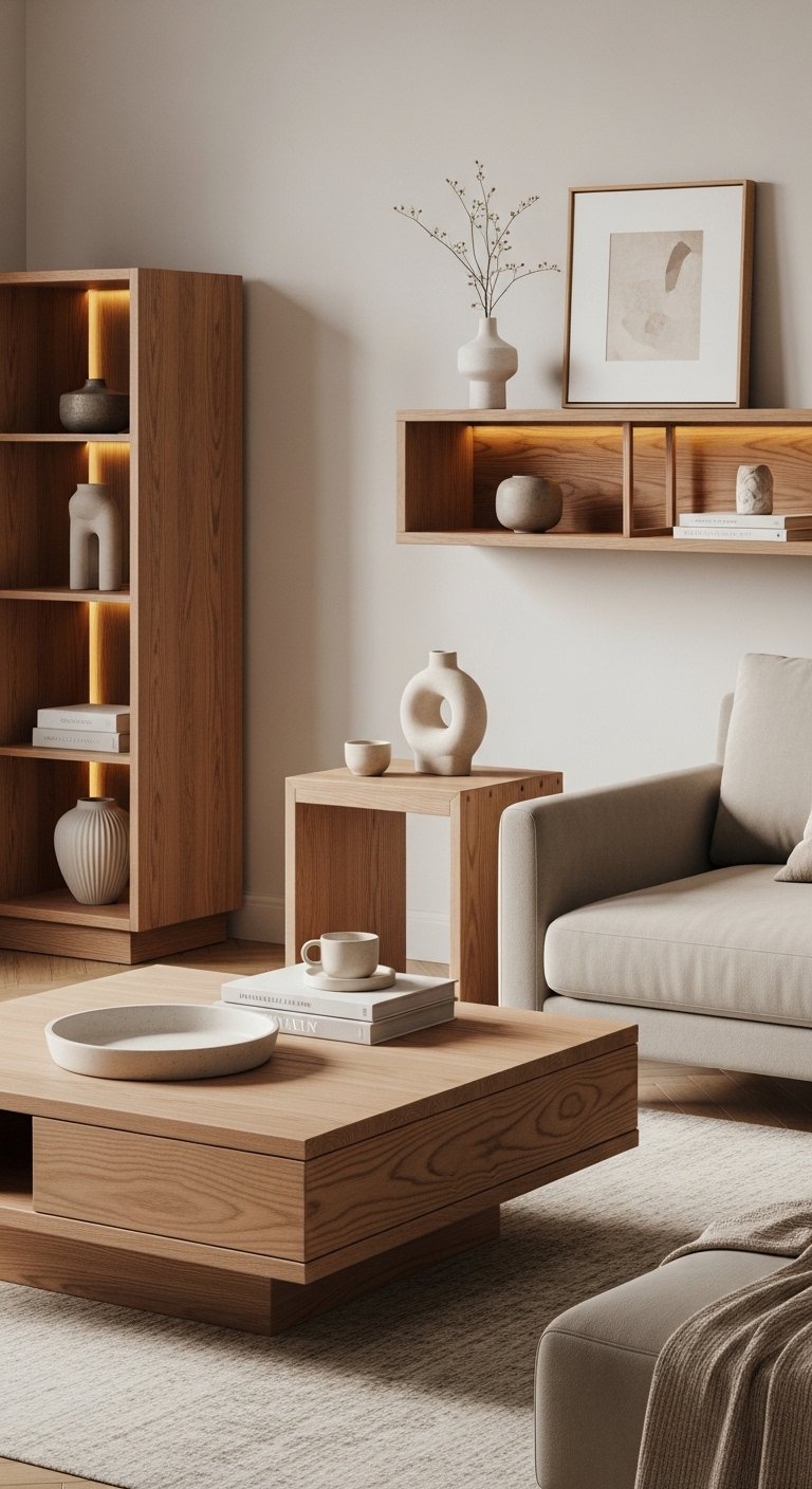 Layering different wood tones creates a rich and inviting space. Use light wood for larger furniture and darker tones for smaller accents.Mix finishes like matte, smooth, and slightly textured surfaces to add depth. Pair wood with soft fabrics to balance warmth and comfort.Keep the color palette neutral so the different wood tones blend naturally. Avoid too many contrasting shades.This approach brings a natural and calming feel to your living room while still looking refined and modern.