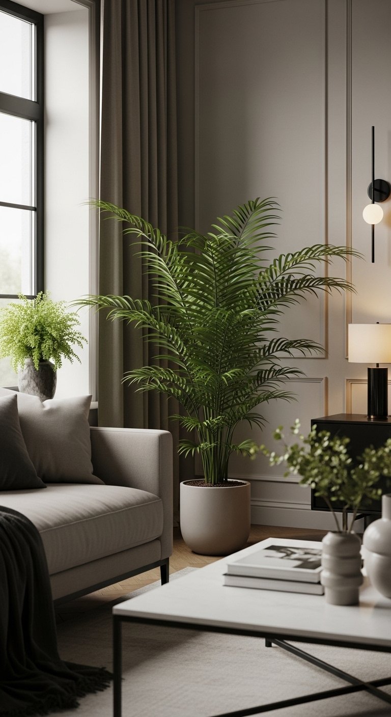 Plants can feel luxurious when styled thoughtfully. Choose large plants with clean shapes, like tall leafy greens or sculptural branches.Place them in simple pots made of stone, ceramic, or matte metal. Keep colors neutral to match your room’s palette.Position plants where they can catch natural light. Corners, near windows, or beside furniture work best.Avoid overcrowding. One or two well-placed plants create more impact than many small ones.This idea adds life, color, and freshness while keeping your space calm and elegant.