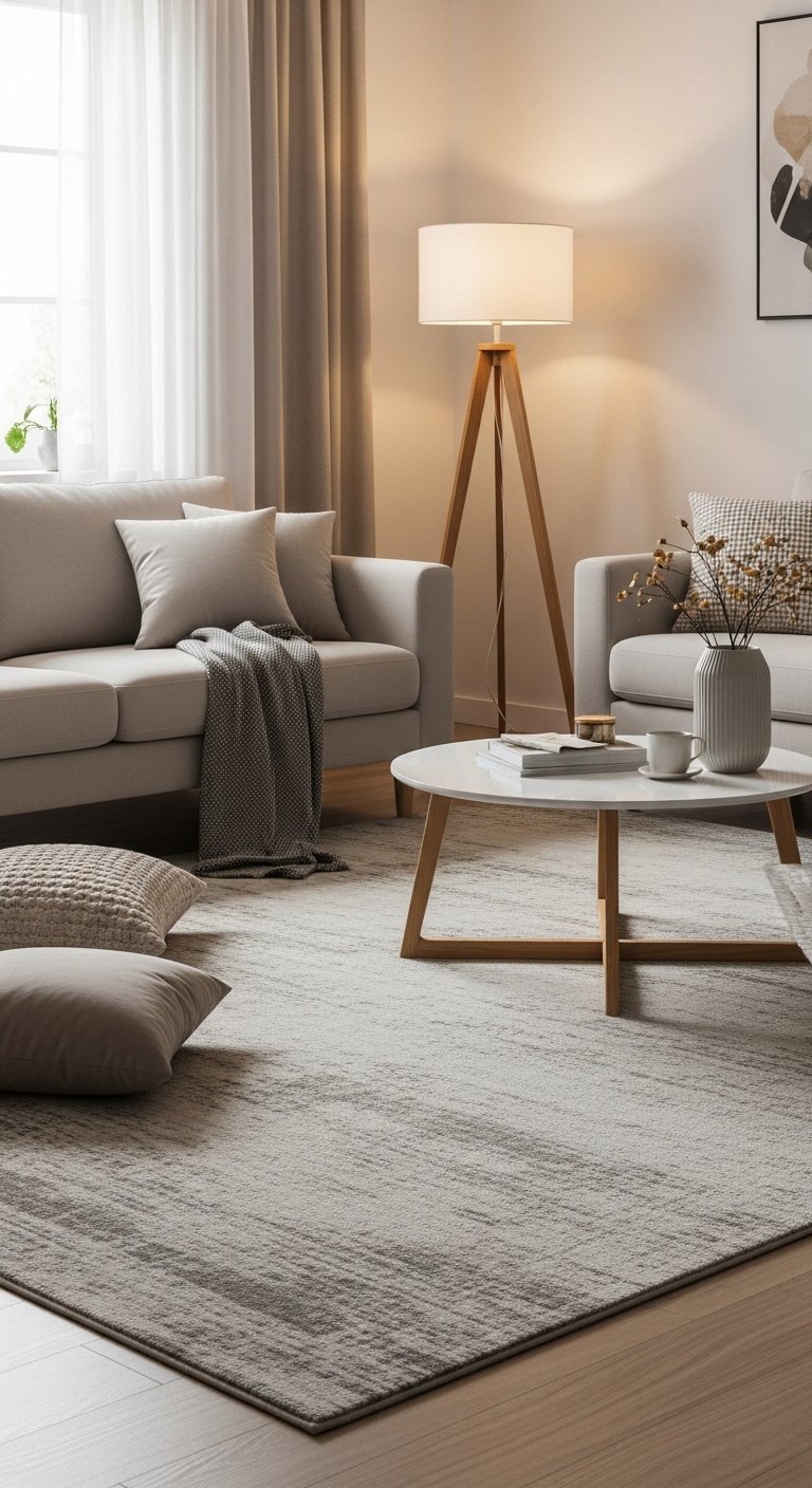 A high-quality rug can define your entire living room. Choose one with a soft texture and subtle pattern to add depth without distraction.Neutral tones like cream, taupe, or light grey work best for a modern luxury feel. Make sure the rug is large enough to fit under your main furniture pieces.Layering a smaller rug on top can add extra texture and interest. This works especially well in larger rooms.The right rug makes your space feel complete, comfortable, and visually connected.