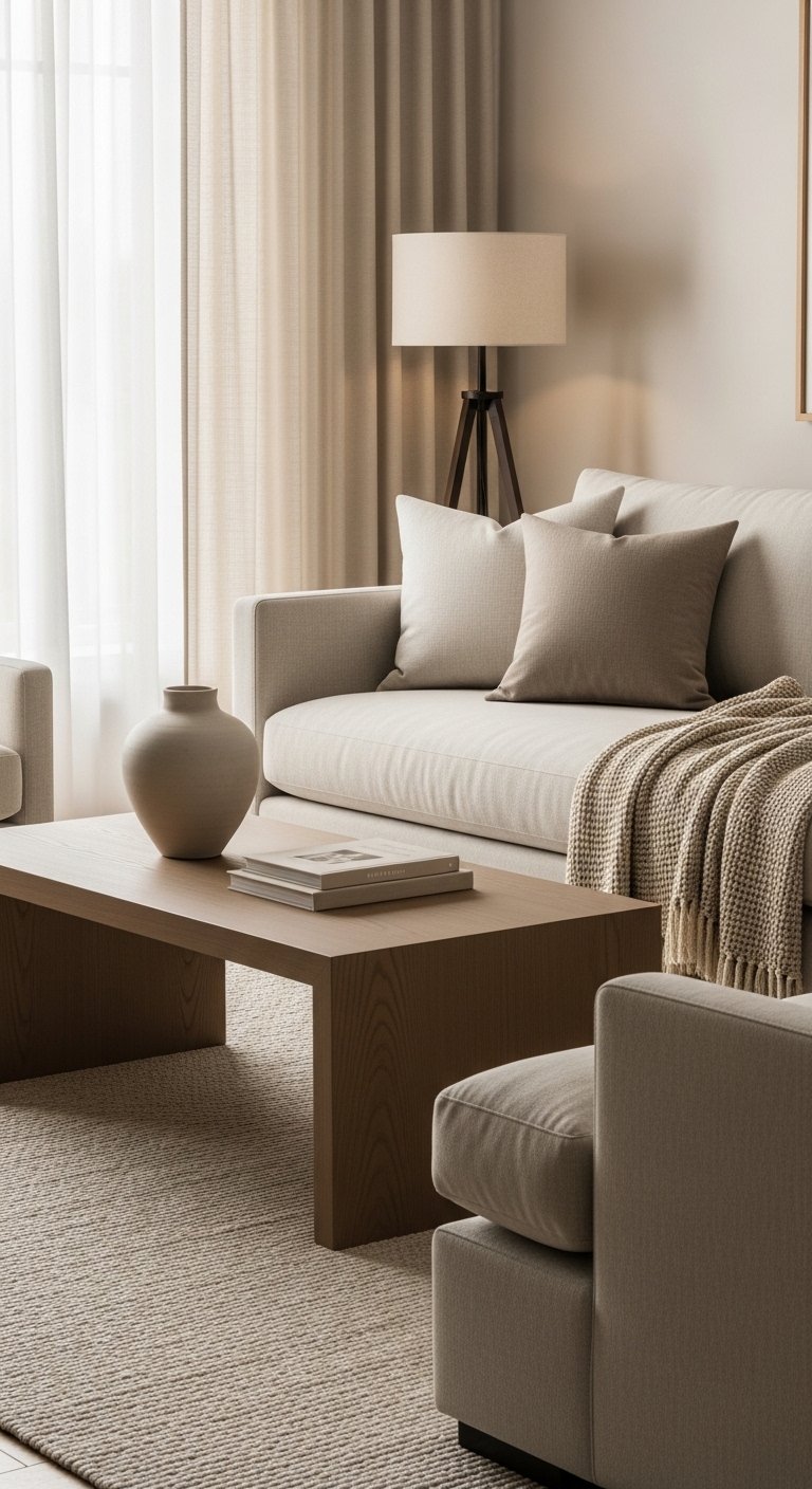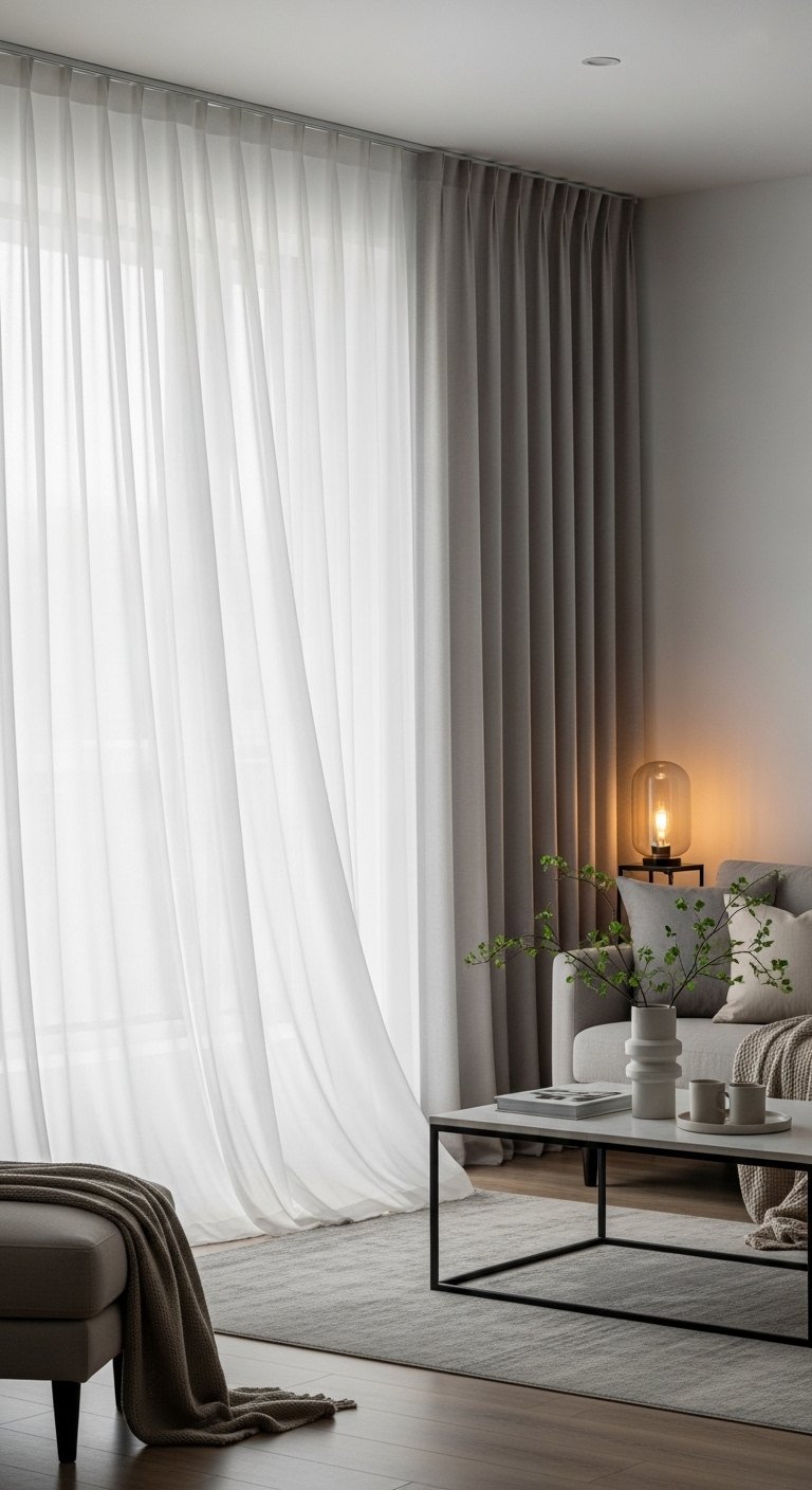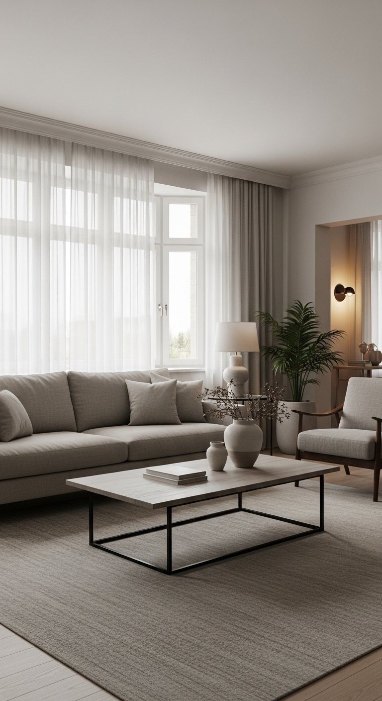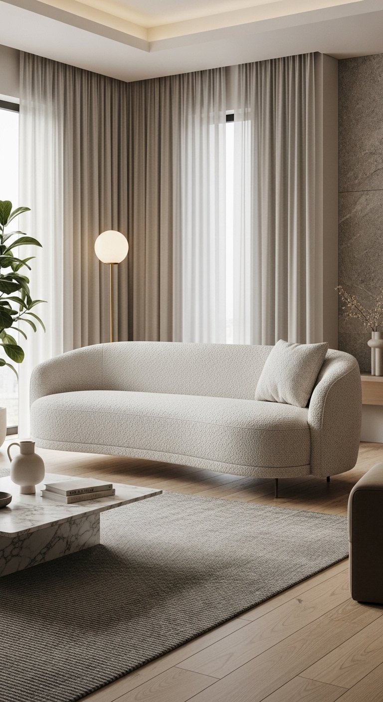 Curtains play a big role in creating a luxury atmosphere. Choose long, flowing fabrics like linen or sheer cotton in soft neutral tones.Hang them from ceiling height instead of just above the window. This makes the room feel taller and more open.Let the curtains gently touch the floor for a relaxed, elegant look. Avoid heavy patterns and focus on texture instead.Natural light filtering through soft fabric creates a warm and calming effect. This makes your space feel bright during the day and cozy at night.Curtains are a simple change that can transform the entire mood of your living room.