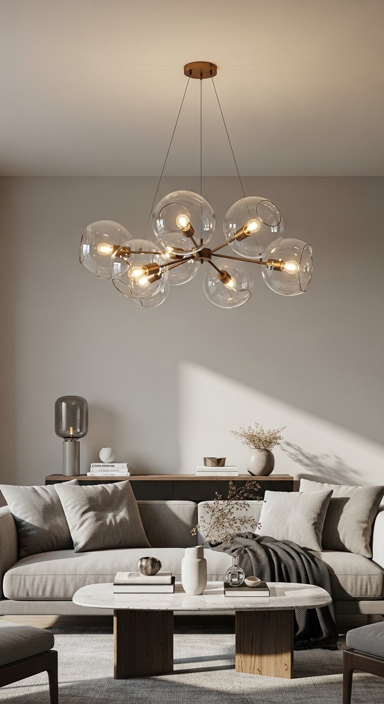A bold lighting fixture can transform your living room into a design statement. Choose a chandelier or pendant with a unique shape, such as sculptural metal forms or soft globe clusters.Place it at the center of your seating area so it naturally draws attention. Keep surrounding décor minimal to let the lighting stand out.Use warm light bulbs to create a soft glow that enhances the room’s mood. Materials like brass, frosted glass, or matte black finishes add a modern touch while still feeling timeless.This idea blends function with visual impact. It not only lights the space but also acts as a centerpiece that defines your entire room’s style.