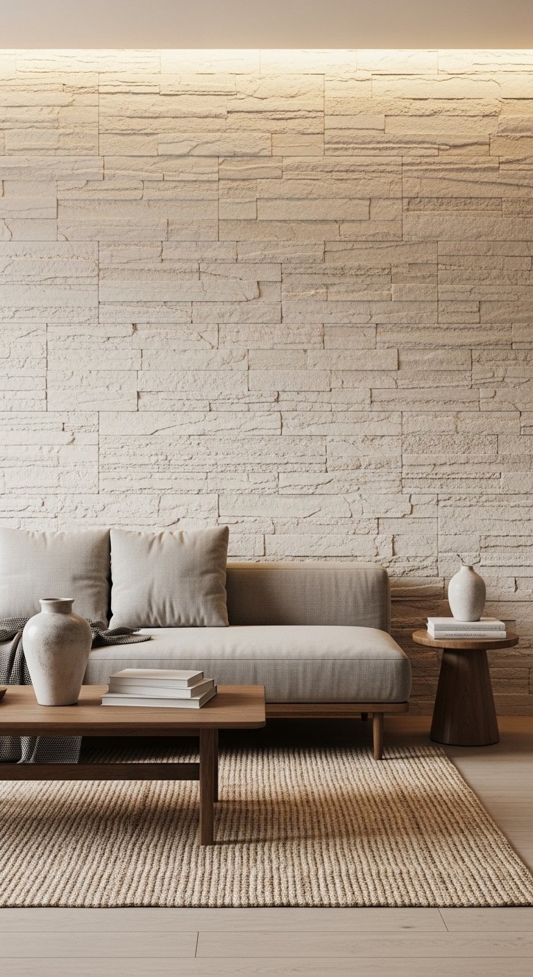 A stone feature wall brings a strong sense of luxury while staying natural and calm. Choose materials like travertine, marble, or textured limestone in soft neutral shades. These stones add depth without needing bold colors.Place the stone wall behind your main seating area or TV unit. Keep the rest of the room simple so the texture stands out. Pair it with wooden furniture or soft fabric sofas to balance the look.Use soft lighting from above or below to highlight the natural patterns in the stone. This creates shadows that make the wall feel alive and dynamic.Avoid over-decorating this area. Let the stone be the main focus. This approach feels modern and elegant while still warm and inviting.
