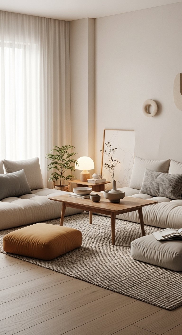 A low seating arrangement creates a relaxed and luxurious vibe. Choose sofas and chairs with lower heights and clean lines. This makes the room feel more open and connected.Add a large area rug with a soft texture to anchor the space. Neutral tones with subtle patterns work best. Place cushions in different fabrics like linen, velvet, and wool to add layers.Keep your coffee table low and simple. Materials like wood, stone, or glass work well. This keeps the focus on comfort and flow.This layout also improves visual balance. It allows artwork, lighting, or walls to stand out more. The result is a calm, modern space that feels both stylish and easy to live in.