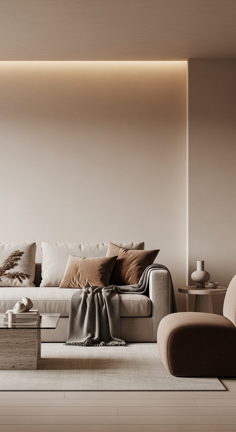 Layering neutral tones creates a calm yet rich living room that feels effortlessly luxurious. Start with a base color like warm beige, soft ivory, or light taupe, then build depth by adding slightly darker or lighter shades of the same palette.Use a mix of textures to bring these tones to life. Pair a smooth linen sofa with a chunky knit throw or soft velvet cushions. Add a matte wood coffee table and a stone or ceramic accent piece to introduce gentle contrast.Lighting enhances this look beautifully. Natural daylight highlights the soft variations, while warm evening lighting adds depth and coziness.This approach works because it feels simple but never flat. Every layer adds quiet detail, making your space look refined without feeling busy or overwhelming.