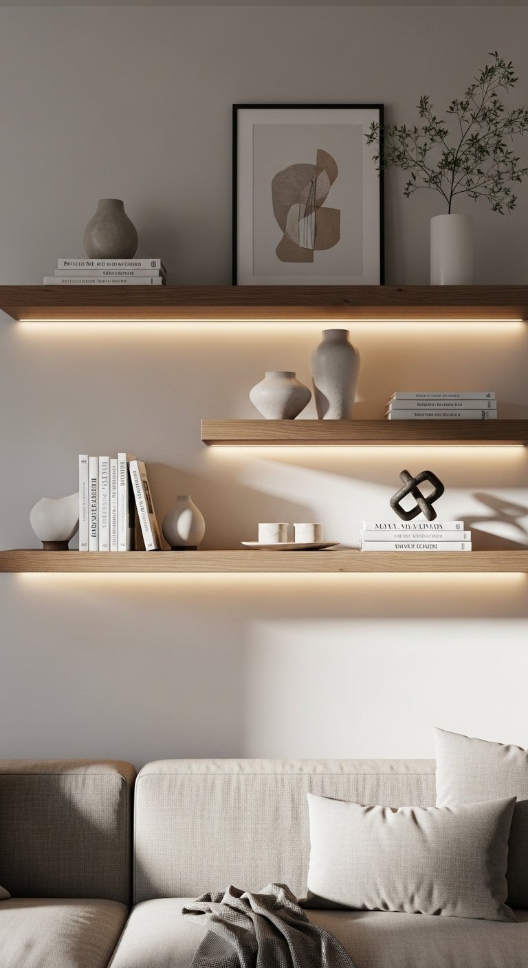 Floating shelves can turn a simple wall into a luxury display. Choose shelves in wood, stone, or matte finishes that match your overall theme.Instead of filling them with many items, focus on a few meaningful pieces. Use a mix of books, ceramics, and small sculptures. Keep space between objects so each one stands out.Add soft lighting under the shelves to create a warm glow. This highlights the objects and adds depth to the wall.Arrange items in small groups rather than straight lines. This feels more natural and less staged.This idea works because it combines function with beauty. Your shelves become part of the design instead of just storage.