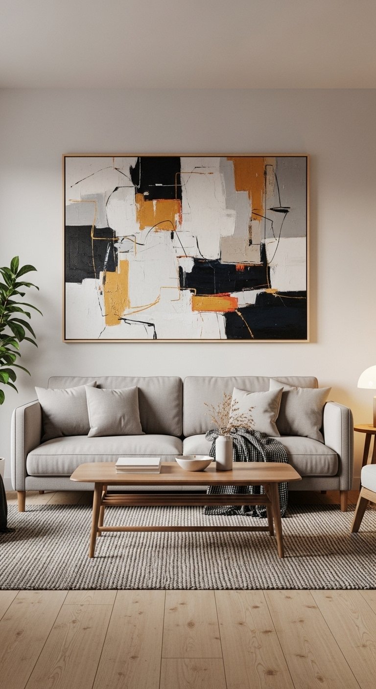 Large artwork creates a strong focal point and instantly elevates your living room. Choose one oversized piece instead of many small ones. This keeps the space clean and impactful.Look for art with soft colors, abstract shapes, or textured finishes. Neutral tones work best for a modern luxury feel.Place the artwork at eye level behind your sofa or on a main wall. Use simple frames or even go frameless for a contemporary look.Lighting plays a big role here. Use a spotlight or wall light to highlight the artwork and create depth.This approach makes your space feel like a gallery while still being comfortable and inviting.