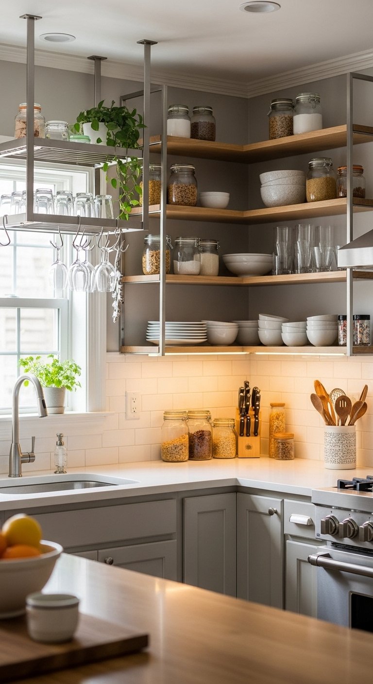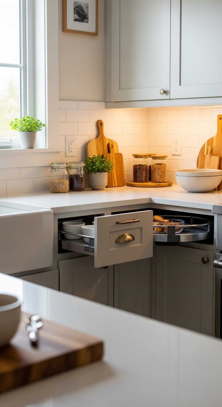 Corners often go unused, shrinking usable kitchen space. Installing rotating lazy Susans, pull-out corner drawers, or angled shelving maximizes storage efficiency without crowding the room. Transparent containers and labeled baskets make it easy to organize items, keeping countertops clear and the kitchen visually open. For a modern, Pinterest-ready look, use minimalist hardware and light-colored materials that blend seamlessly with cabinetry. Smart corner solutions transform awkward spaces into practical storage zones, keeping everything within reach while enhancing the airy, modern feel of a small kitchen.