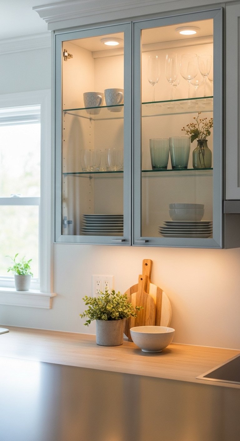 Replacing solid cabinet fronts with glass doors immediately creates a sense of depth and openness. Transparent or frosted glass lets light pass through while showcasing neatly organized dishes, cookbooks, or decorative bowls. Pair glass fronts with interior LED lighting to highlight textures and colors inside the cabinets, making the kitchen feel airy and modern. To keep the look cohesive, limit the style of dishes to a consistent color palette or pattern. This approach works especially well in small kitchens because it visually reduces the weight of upper cabinets, creating a Pinterest-worthy blend of style and practicality.