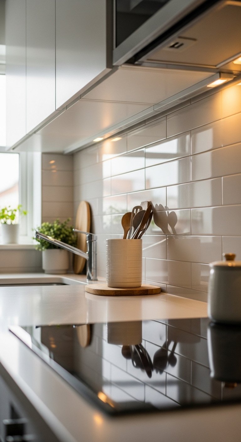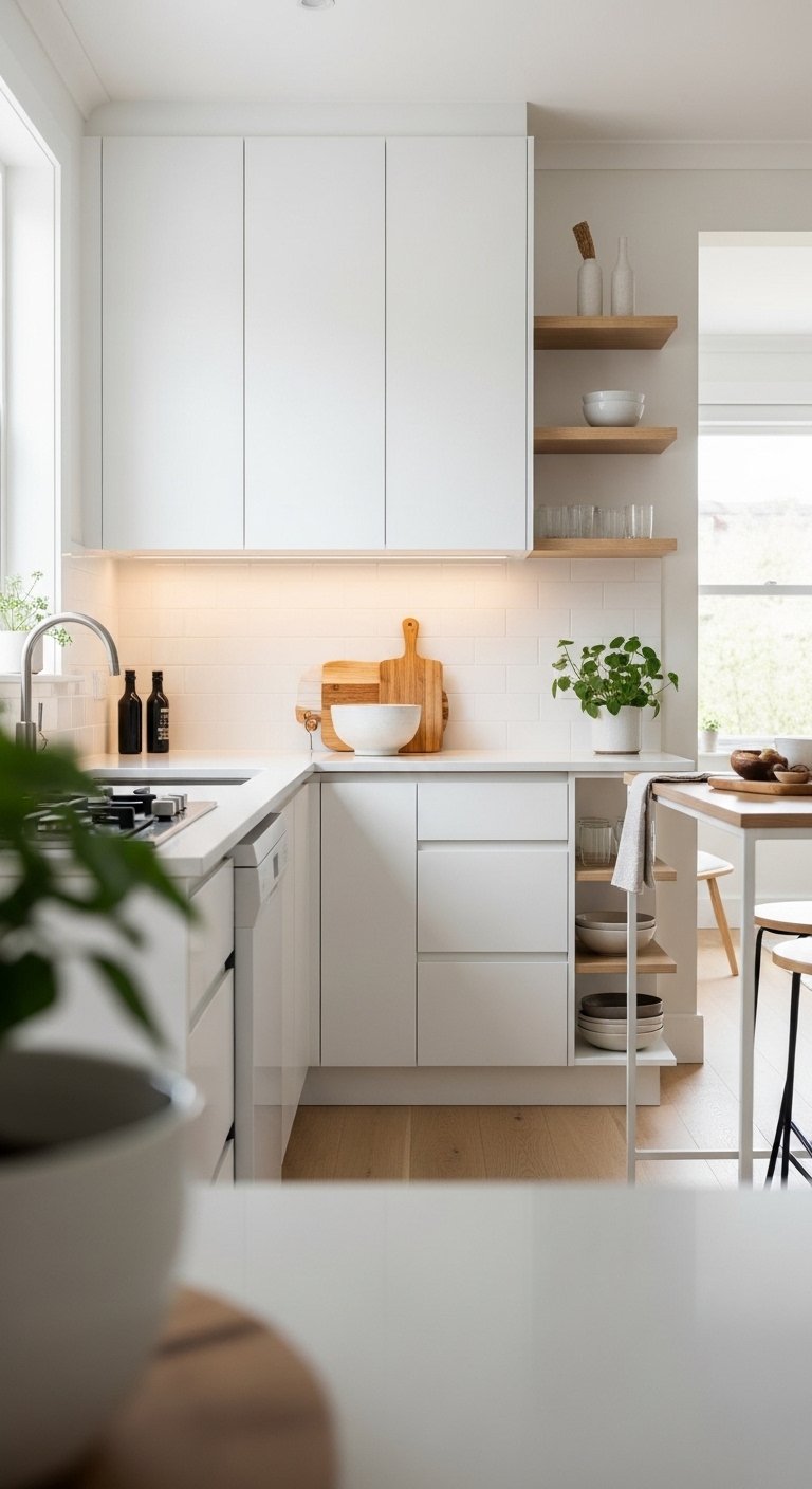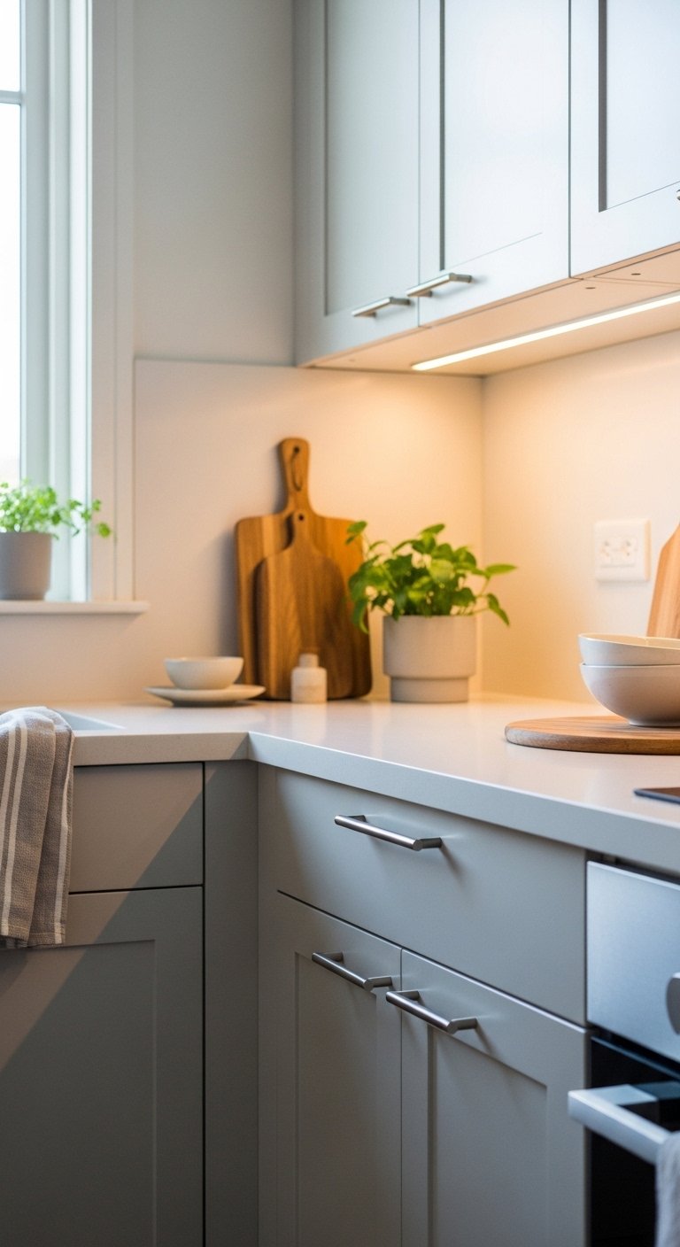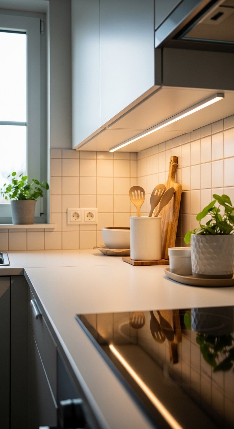 Adding LED strip lights under cabinets illuminates countertops, creating the perception of a larger space. Soft, warm lighting enhances the modern aesthetic while highlighting textures, like marble or quartz surfaces. This technique reduces shadows in small kitchens, making cooking and prep tasks easier and more enjoyable. For a Pinterest-inspired twist, consider dimmable lights that adjust the ambiance from functional work lighting to cozy evening mood lighting. Subtle under-cabinet lighting not only makes a kitchen appear brighter and bigger but also adds a sophisticated, modern detail that draws the eye.