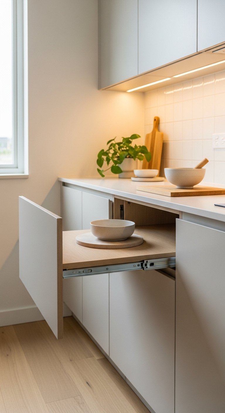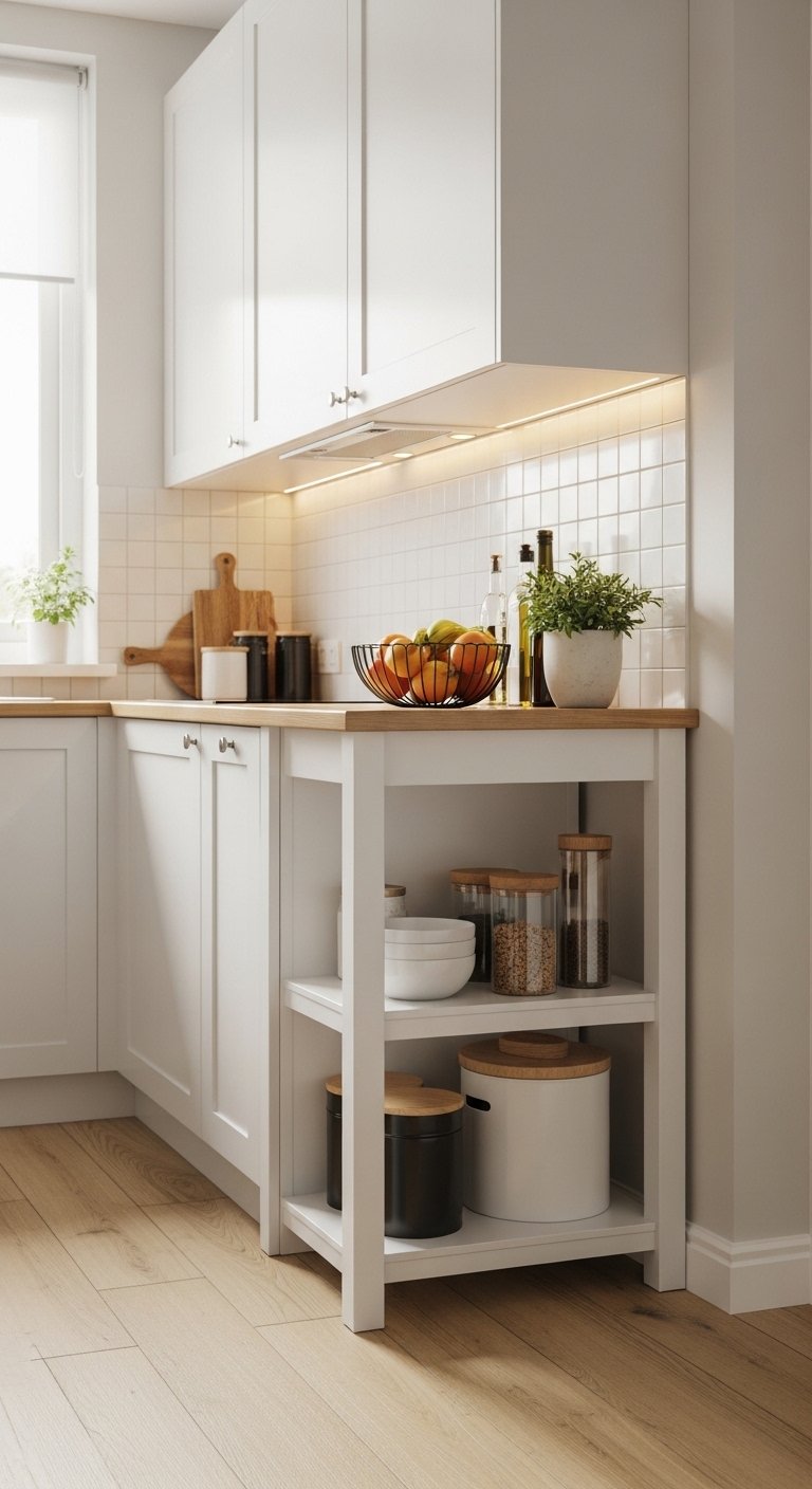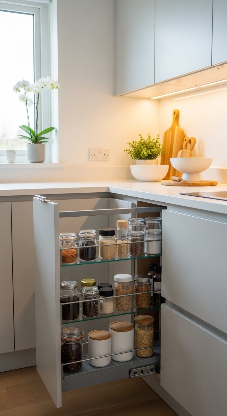 A pull-out pantry makes efficient use of narrow spaces that might otherwise be wasted. Tall, vertical units with sliding shelves store canned goods, spices, or baking essentials neatly while keeping countertops clear. Choosing light-colored finishes and slim handles ensures the unit blends with cabinetry, preserving a spacious look. For Pinterest inspiration, organize items by category, color, or container style to add a visual rhythm that feels modern and curated. A pull-out pantry proves that smart storage solutions can transform a small kitchen into a highly functional and stylish area.