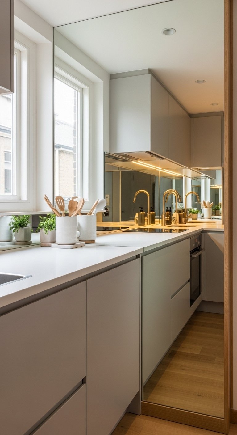 Mirrors are a secret weapon for small kitchens. Placing a large mirror on one wall or as part of a backsplash doubles the perceived space while reflecting natural light. Pair mirrored surfaces with bright or light-colored cabinetry to amplify the airy effect. Mirrors can also highlight textures or colors elsewhere, like a polished countertop or stylish pendant lights. On Pinterest, mirrored kitchens often feel modern and luxurious without the need for structural changes, making it a practical, visually impactful solution for compact spaces.