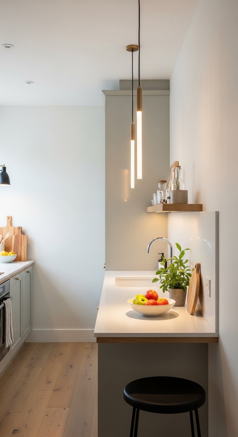Hanging pendant lights above an island, counter, or breakfast nook draws the eye upward, giving the impression of taller ceilings. Sleek, slim designs in metallic finishes or glass shades complement modern aesthetics while maintaining openness. For a visually light effect, avoid oversized or heavily detailed fixtures, which can overwhelm a small kitchen. Layer the pendants with under-cabinet lighting to balance brightness across the room. This combination of vertical focus and well-distributed light creates a Pinterest-worthy, airy feel that emphasizes both style and spatial perception.