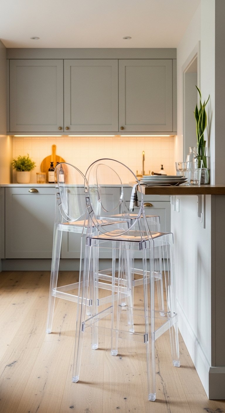 Seating made of clear acrylic or ghost chairs visually disappears in a compact kitchen, making the space feel larger. These lightweight pieces maintain modern aesthetics while allowing light and sightlines to pass through. Pair them with a slim dining table or island to prevent overcrowding. On Pinterest, kitchens with transparent seating often appear effortlessly airy, chic, and inviting. These pieces are perfect for small spaces where bulky chairs would block sightlines or interrupt the room’s flow.