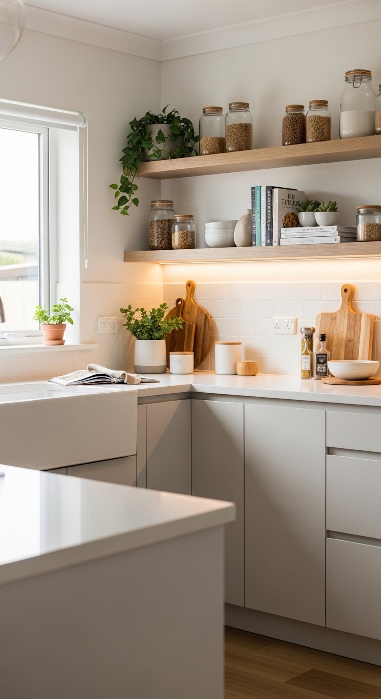 Installing floating shelves above counters or in unused corners provides storage without taking up floor space. Use them to display stylish containers, small plants, or cookbooks, creating visual interest while keeping essentials accessible. Keep shelves light in color or material to maintain a sense of airiness, and avoid overcrowding for a Pinterest-ready aesthetic. Floating shelves emphasize verticality and openness, transforming small kitchens into modern, visually dynamic spaces that feel larger than they are.