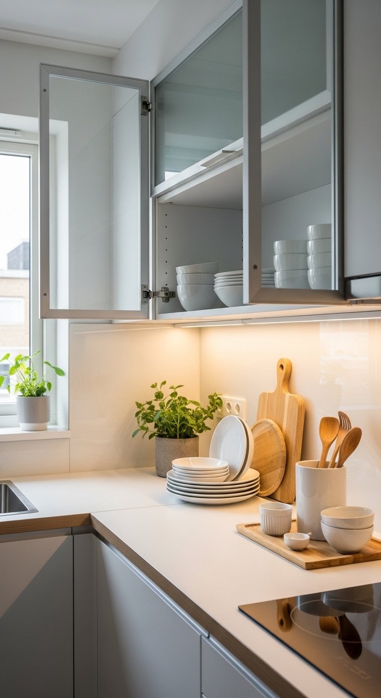 Replacing solid cabinet panels with glass or acrylic inserts opens up the space visually while maintaining storage functionality. Choose frosted or lightly tinted glass for a modern, elegant touch that still hides minor clutter. Display your most attractive dishware, glassware, or decorative bowls behind the inserts to create depth and interest. Adding subtle interior LED lights enhances the effect, making cabinets glow softly and reflect light across the room. This approach instantly adds sophistication, height, and openness, giving your small kitchen a Pinterest-worthy, airy feel without adding square footage.