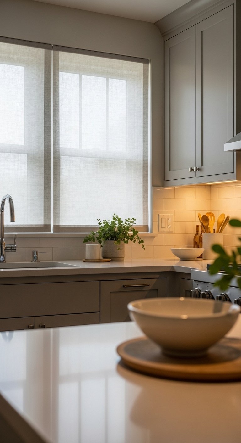 Maximizing natural light is essential in a small kitchen. Choose sheer or light-colored curtains, roman shades, or blinds to allow sunlight to brighten the space while maintaining privacy. Soft fabrics in cream, pale grey, or pastels complement modern cabinetry and countertops without weighing down the room. Natural light not only highlights textures, colors, and metallic accents but also makes the kitchen appear larger. Pairing window treatments with mirrors, reflective surfaces, and open shelving amplifies brightness and openness. Pinterest users love this simple yet effective trick to make a small kitchen feel airy, modern, and inviting.