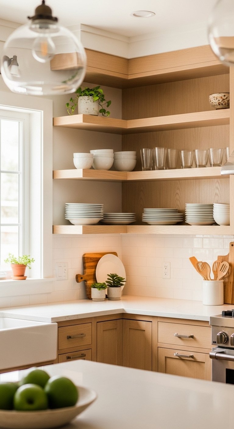 Replacing upper cabinets with open shelves instantly frees up visual space, making your kitchen feel larger. Use light-colored or natural wood shelves to maintain a clean, modern look. Arrange everyday items like plates, glasses, and bowls neatly, combining functional storage with decorative display. Adding small plants or framed prints can bring in color and texture, making the shelves a stylish focal point. To maintain a spacious feel, keep clutter minimal and balance the shelf spacing evenly. Open shelving also encourages thoughtful organization, which is essential in a small kitchen. Pinterest users love this approach because it feels personal, airy, and creative while still practical for cooking and entertaining.