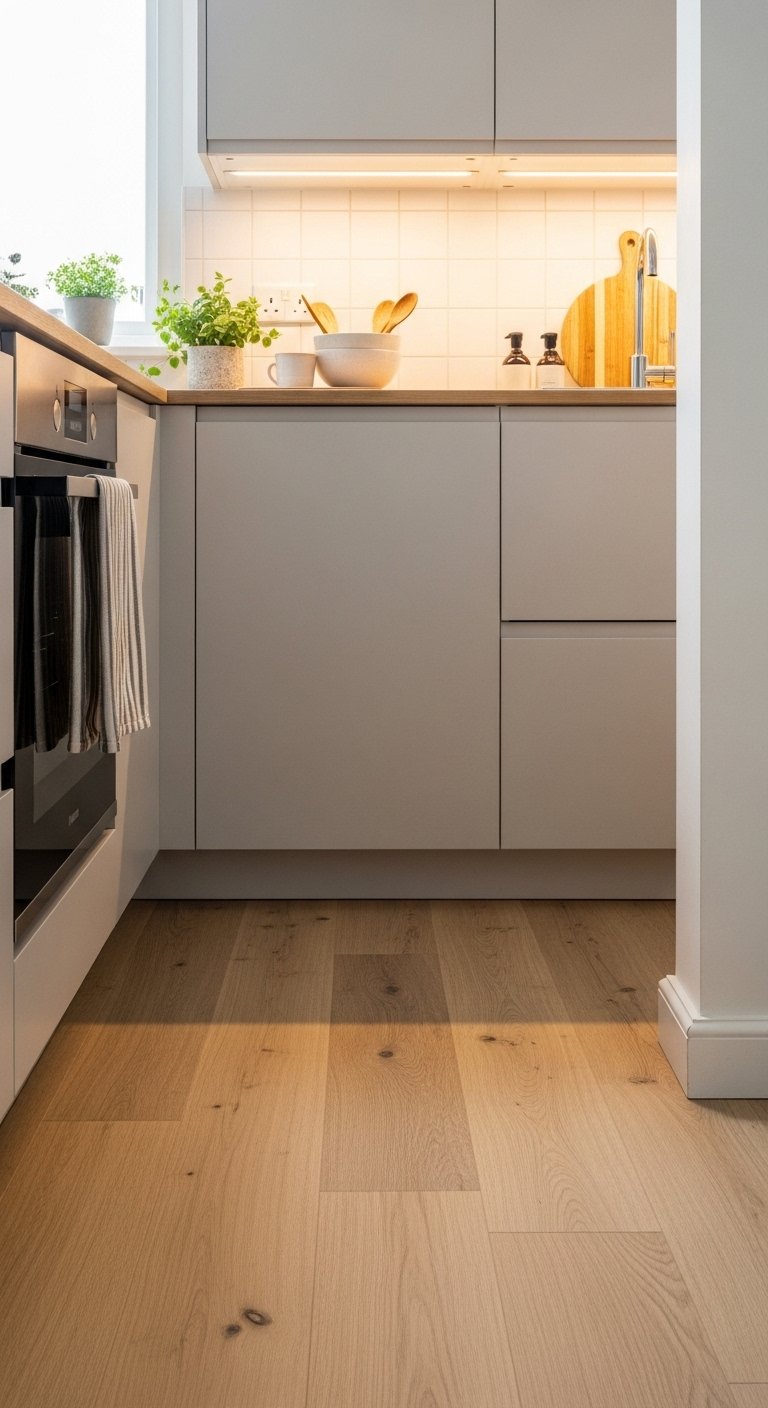 Choosing light wood flooring can visually elongate a small kitchen, creating a continuous flow from room to room. Natural oak or maple tones add warmth without darkening the space, complementing modern cabinetry and countertops. For an extra Pinterest-inspired touch, install planks lengthwise to draw the eye along the room’s longest dimension. Pair the wood with neutral walls and reflective surfaces to maintain brightness. Light wood flooring also pairs beautifully with greenery or textured rugs for a cozy, modern vibe. This simple upgrade can dramatically enhance the perception of space while adding character and style.