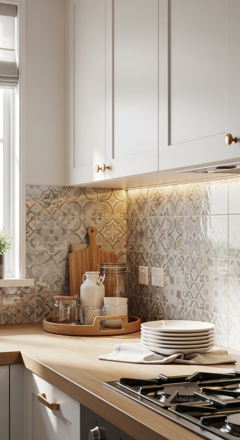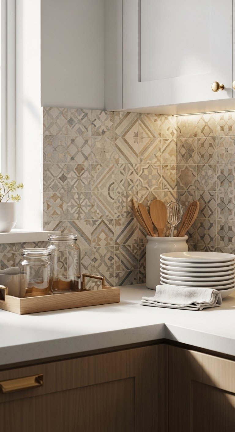 Introduce patterned tiles in a soft, coastal color palette for backsplashes or accent walls. Think soft blues, sandy neutrals, and muted whites.Geometric, wave-like, or seashell-inspired patterns can add interest without overwhelming the space. Keep patterns limited to one area, such as behind the stove or sink, to avoid visual clutter.Pair tiles with plain countertops and light cabinetry to keep balance. This creates a focal point while preserving the overall airy feel of the kitchen.Tiles also offer practicality. They’re easy to clean and durable, making them perfect for busy kitchens.This idea adds charm, texture, and subtle coastal personality. It’s a small upgrade that instantly communicates a beach-inspired vibe.