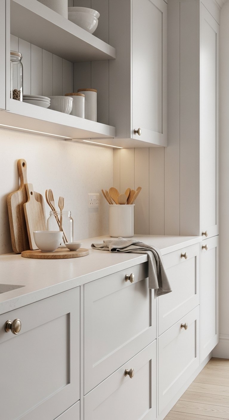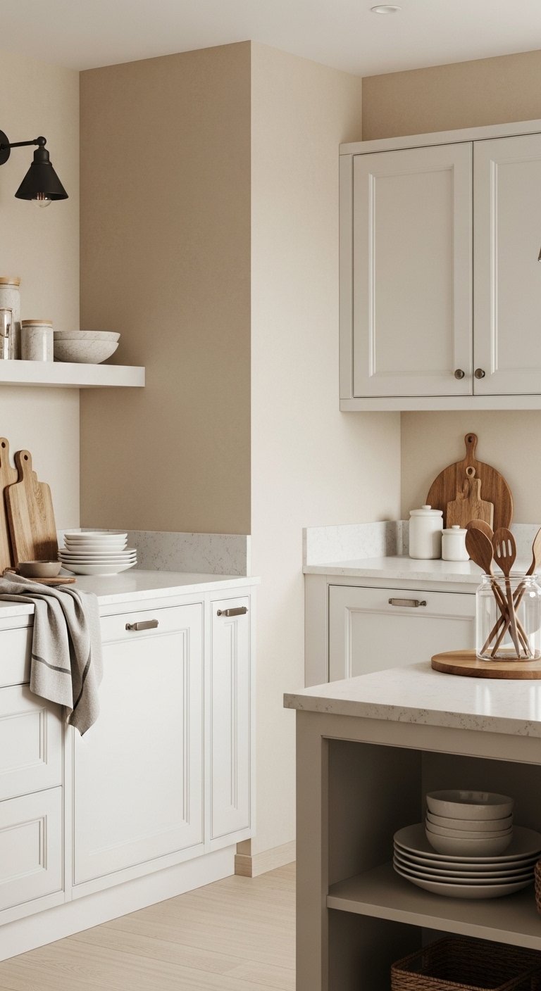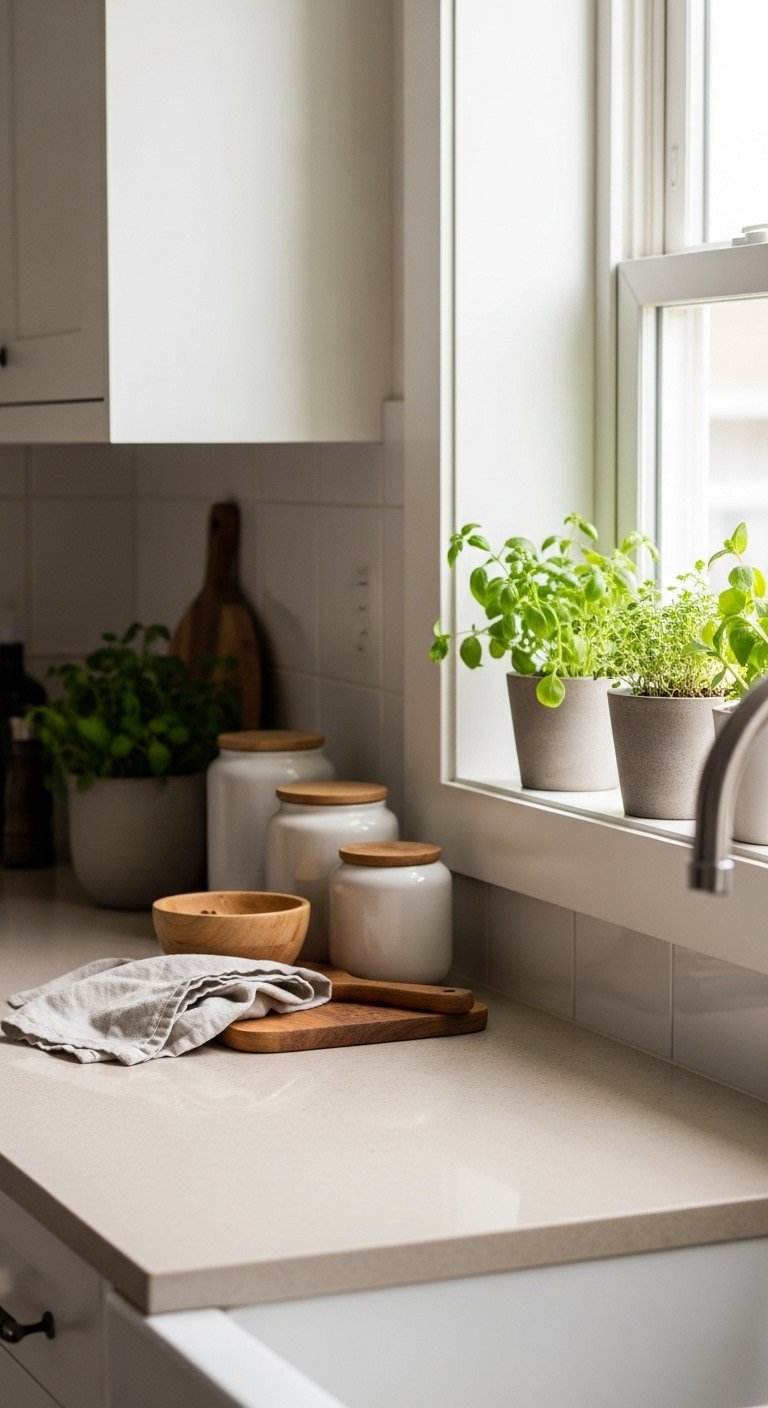 Start with a soft white and sandy beige color palette to create a clean coastal foundation. These colors reflect light and instantly make your kitchen feel bigger and brighter. Use warm white on cabinets and pair it with beige or light sand tones on walls or backsplash.Choose matte finishes instead of glossy ones for a more natural look. Add subtle texture through linen curtains or woven placemats. This keeps the space from feeling flat while still staying calm and simple.For countertops, light quartz or marble with soft veining works well. It adds detail without making the space busy. Keep hardware in brushed nickel or soft gold for a gentle shine.This base allows you to easily add coastal accents later without overpowering the space. It creates a peaceful mood that feels like a quiet beach morning.