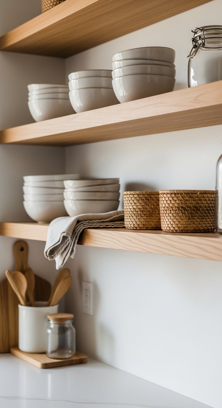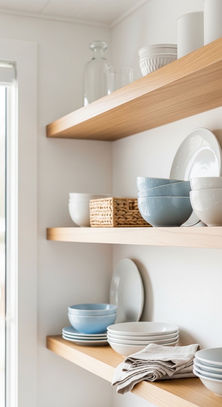 4. Open Shelving with Coastal Styling
