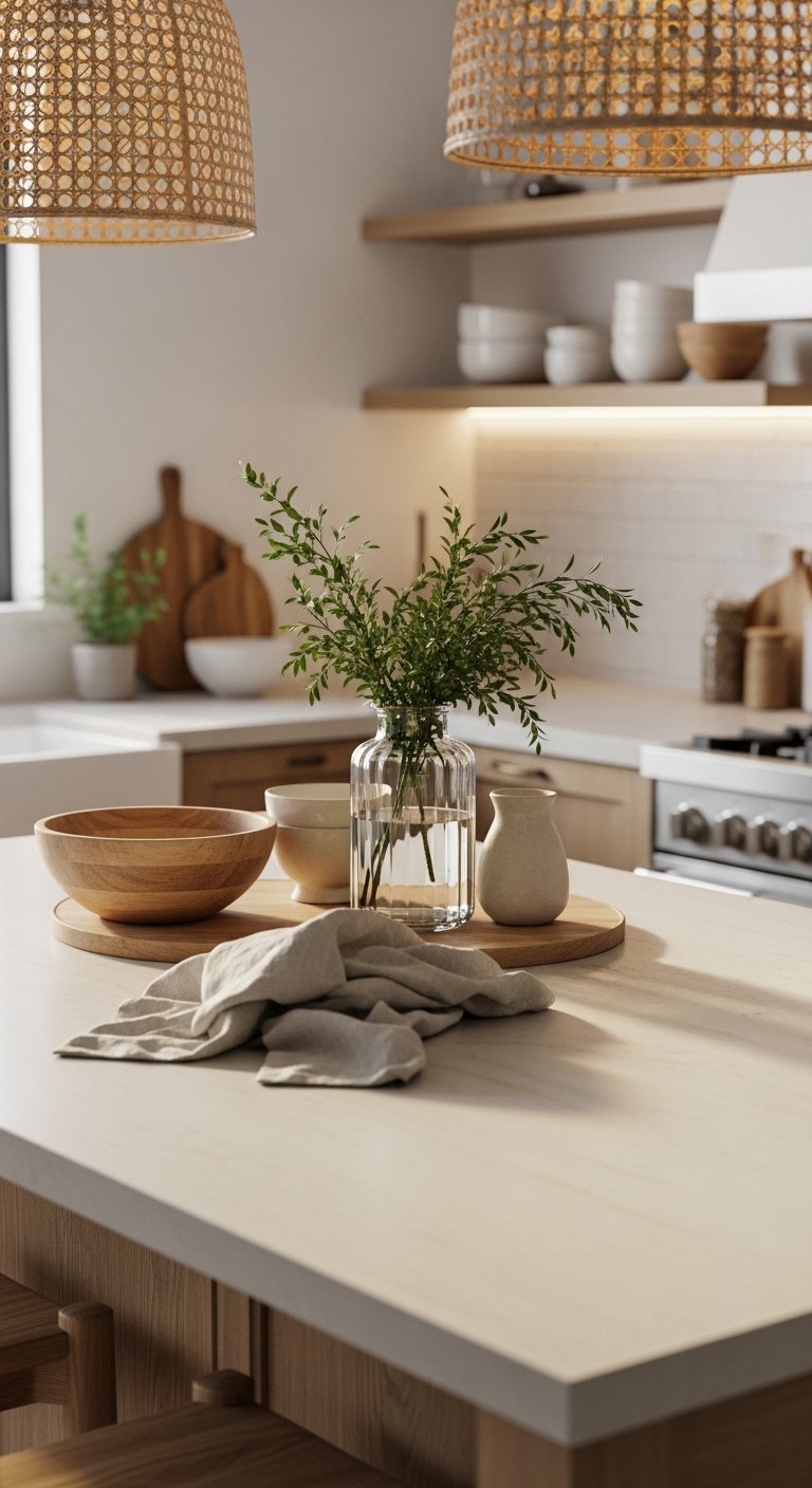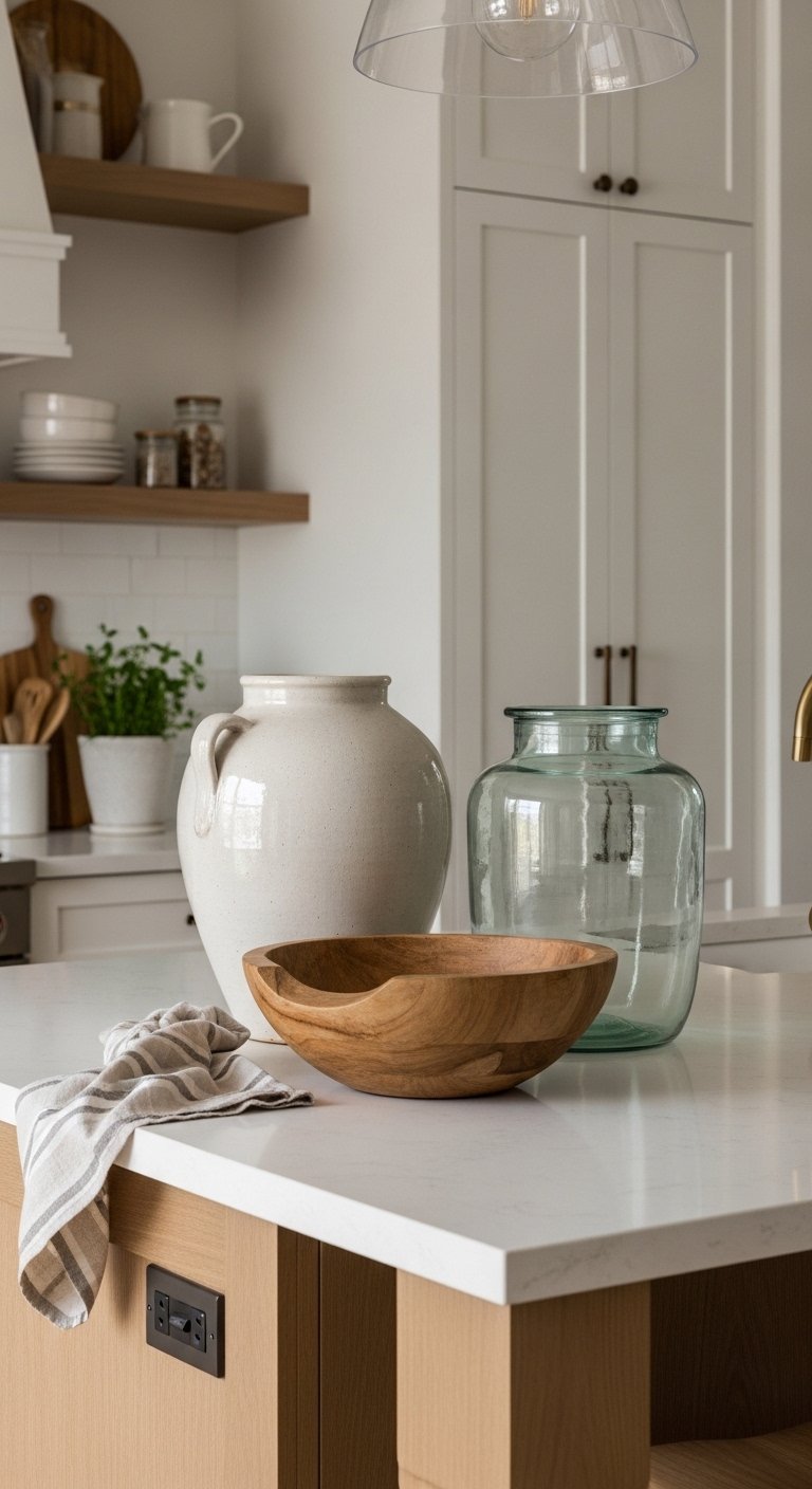 Finish your coastal kitchen with statement accessories that tie the room together. Think large ceramic vases, oversized glass jars, or a single bold piece like a wooden bowl.Choose items with soft, neutral tones or muted blues and greens. Place them strategically—on an island, countertop, or shelf—to create focal points without cluttering.Mix natural textures like wood, glass, or stone for interest. Limit the number of statement pieces so each stands out and complements the calm aesthetic.These final touches give your kitchen personality and style, completing the beachy, Pinterest-ready look. They make your space feel curated, polished, and full of coastal charm.