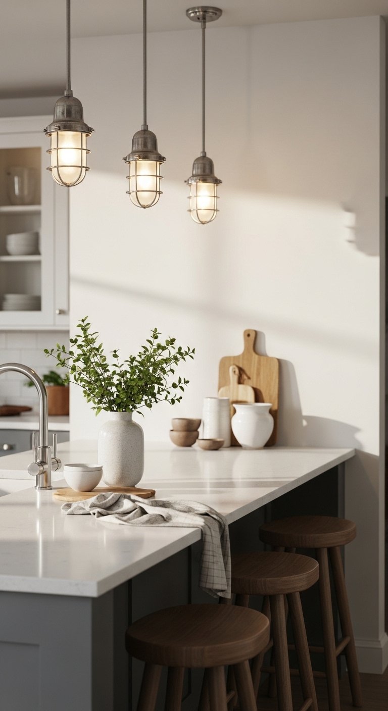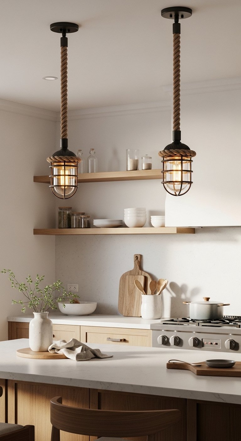 Add nautical-inspired lighting to enhance the coastal vibe while keeping your kitchen functional. Lantern-style pendants, rope-wrapped chandeliers, or soft brushed brass lights work beautifully.Focus on warm, ambient lighting that complements daylight. Avoid harsh or overly bright fixtures that disrupt the calm beachy mood.Consider placement over the island, sink, or dining area to create visual focus. A single statement fixture can act as both a light source and a design accent.Pair lighting with subtle coastal textures—like rope, driftwood, or matte metals—to create a cohesive look. Even small pendants with natural accents can make a big impact.Lighting is a subtle but powerful tool to convey a beachy aesthetic. Well-chosen fixtures elevate the style while maintaining a cozy, fresh coastal atmosphere.