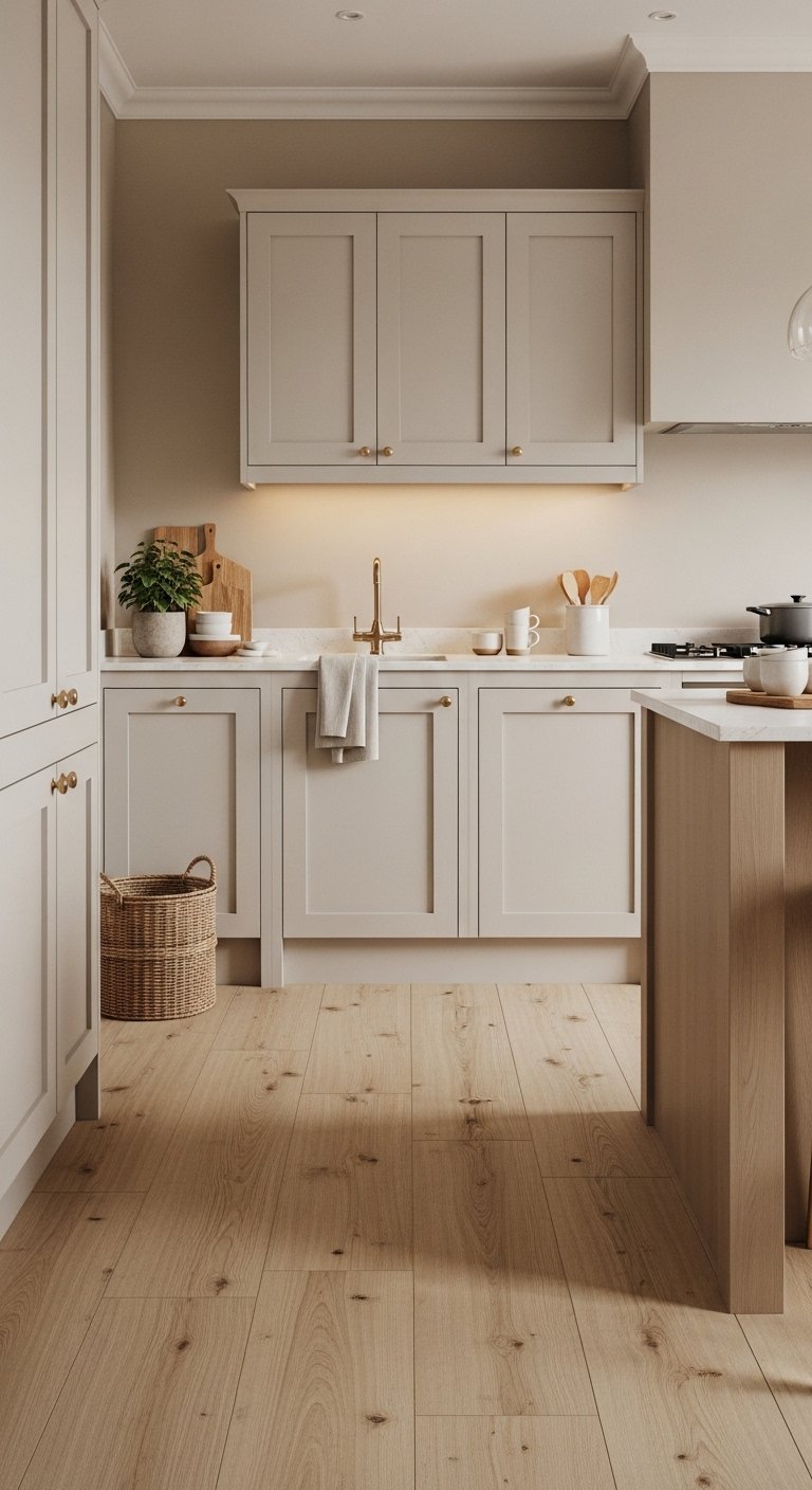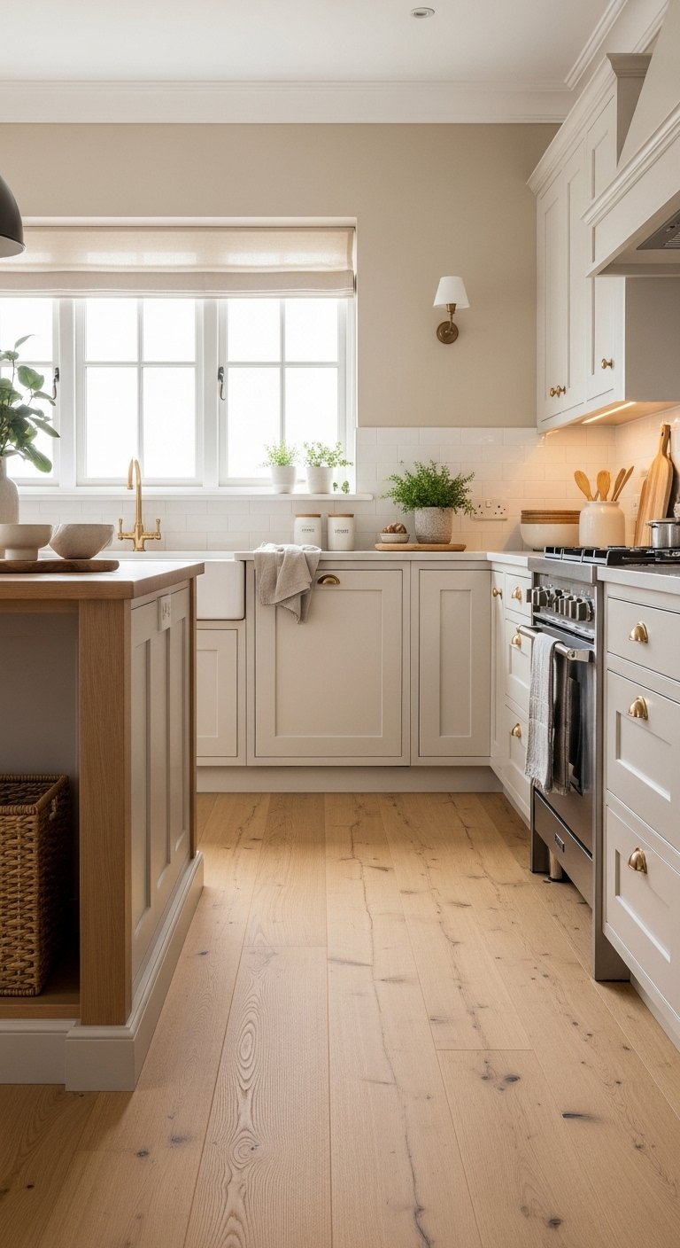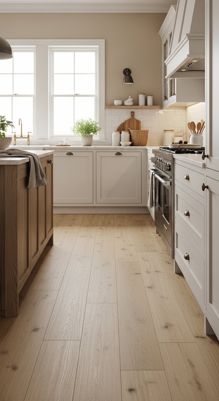 Choose light-toned, durable flooring that evokes sand and driftwood. Options like bleached oak, whitewashed laminate, or neutral porcelain tiles work beautifully.Patterns can be simple planks or subtle herringbone to add interest without overpowering the space. Soft beige or gray undertones enhance the airy, beachy mood.Consider durability and easy maintenance for practical use. Add a natural fiber rug in high-traffic areas for warmth and comfort.This foundation ties the entire kitchen together. Light flooring brightens the room, visually expands the space, and reinforces the fresh coastal aesthetic that Pinterest lovers will admire.
