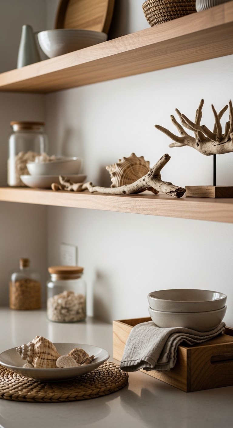 Incorporate seashells and driftwood as small decorative accents to reinforce the beachy theme. Place them in glass jars, on open shelves, or as part of a centerpiece on the island.Choose natural textures and muted tones that complement your color palette. Avoid overly polished or brightly colored shells—they should feel organic and collected.Driftwood can also be used as a base for small kitchen accessories, like cutting boards, utensil holders, or candle trays. Pair with white, blue, or sandy tones to maintain cohesion.These natural accents bring a subtle seaside charm and tactile texture, connecting the indoors with the feeling of the coast. They’re simple, inexpensive, and highly Pinterest-worthy, perfect for creating that serene, relaxed vibe.