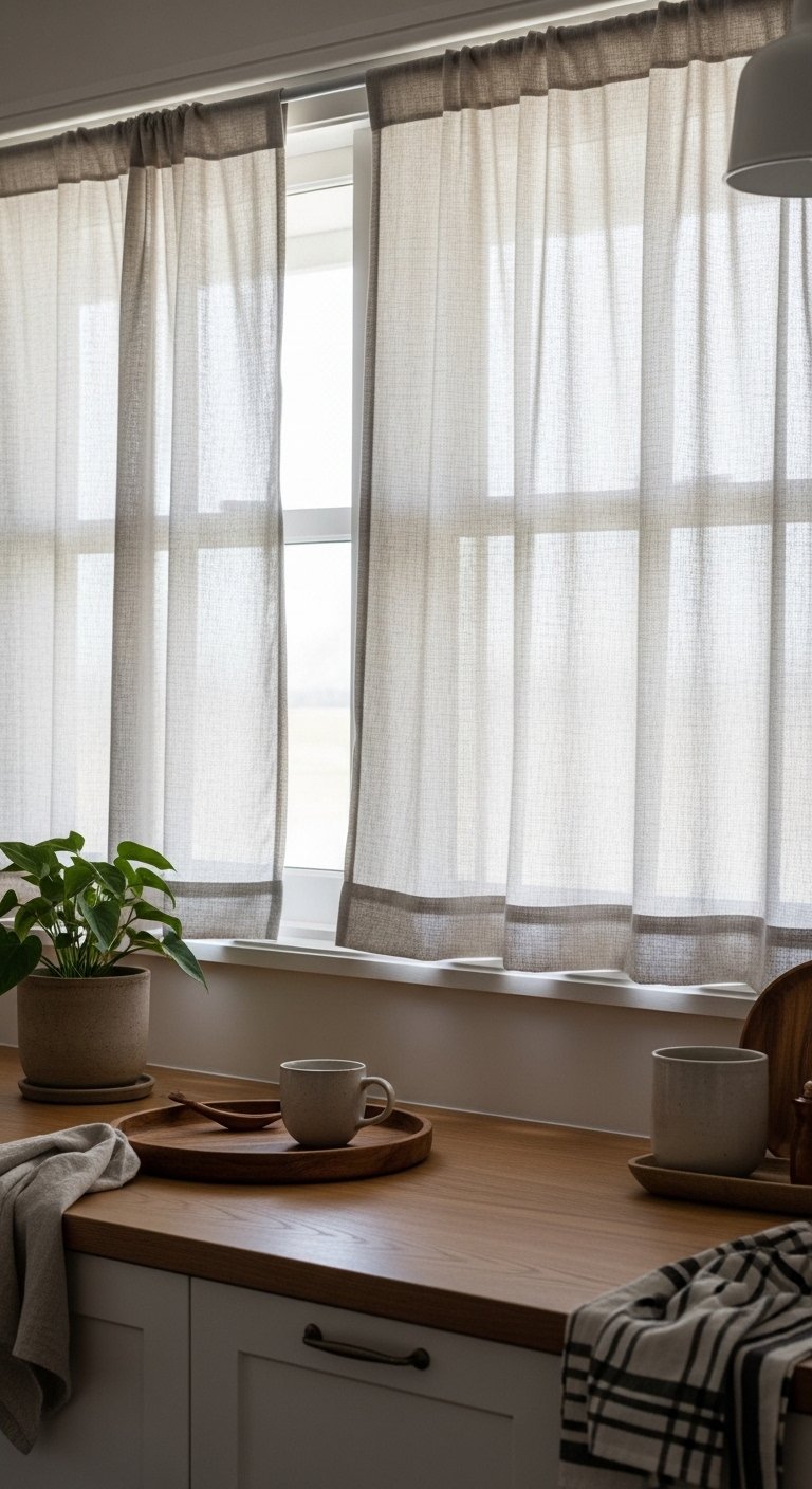 Use sheer or light linen curtains to allow sunlight while maintaining privacy. This creates a breezy, coastal atmosphere that feels effortless and natural.Choose white, soft cream, or very pale blue fabrics to complement cabinetry and walls. Keep patterns minimal to maintain a clean, open look.Hang curtains slightly higher than the window frame to create a sense of height and openness. Let the fabric gently touch the floor or countertop for a soft, elegant finish.These subtle details enhance natural light, highlight your design choices, and make your kitchen feel fresh, inviting, and perfectly in tune with coastal living.