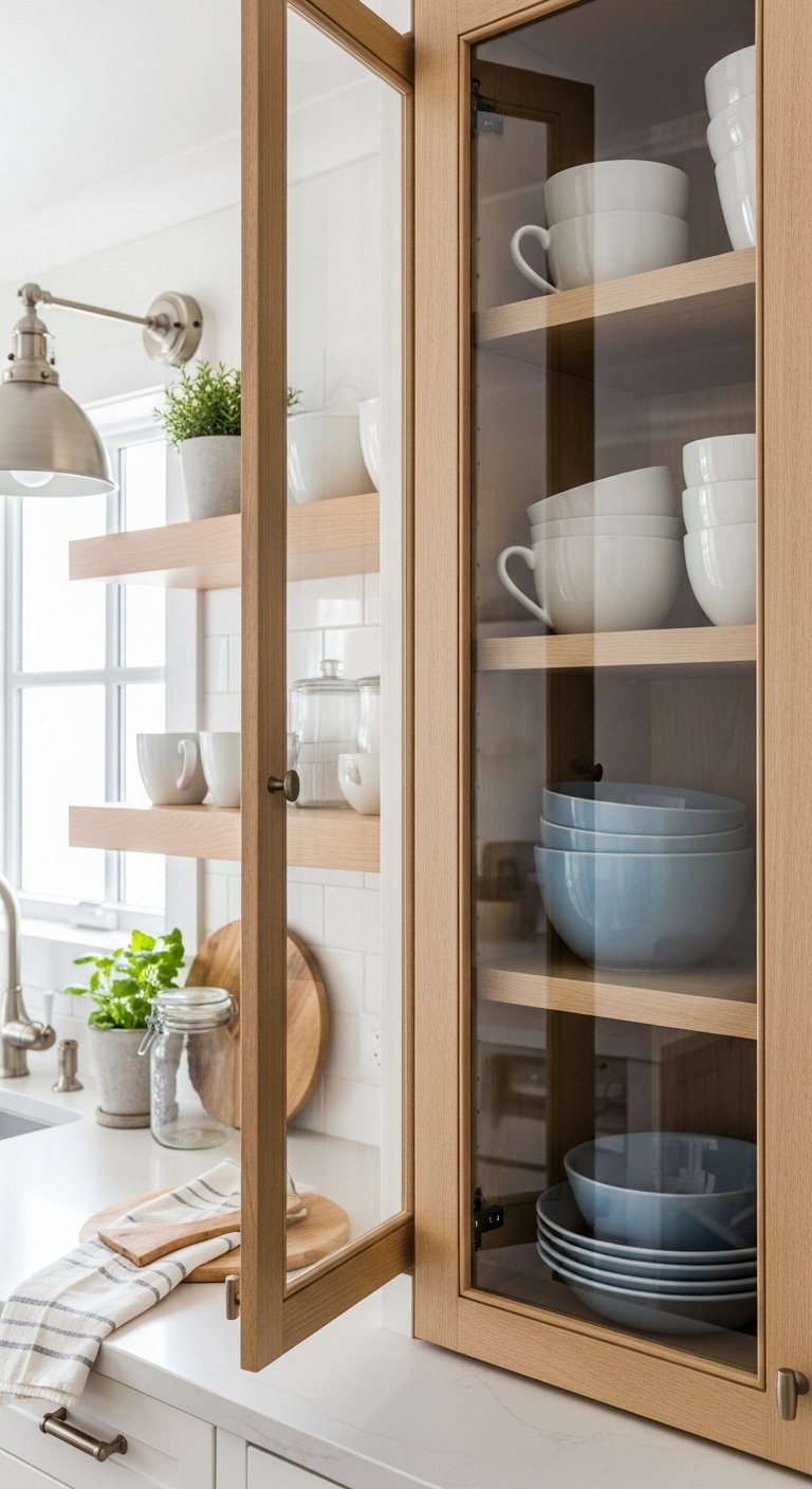Incorporate glass-front cabinets to add openness and a touch of elegance. These cabinets make your kitchen feel less heavy and allow you to display beautiful dishes or glassware.Choose clear or slightly frosted glass paired with white or soft blue frames for a subtle coastal look. Arrange items thoughtfully, keeping a limited color palette to maintain calmness.Layer in natural textures like woven baskets or wooden trays inside the cabinets for warmth. Lighting inside the cabinets can enhance visual appeal, highlighting delicate glassware or pastel ceramics.This design trick turns storage into decor, keeping your kitchen airy while adding personality. It’s perfect for showcasing coastal-inspired dishware, seashells in jars, or small pottery pieces without overwhelming the space.Glass-front cabinets combine practicality with visual interest, making your kitchen feel open, light, and inviting, much like a breezy seaside cottage.