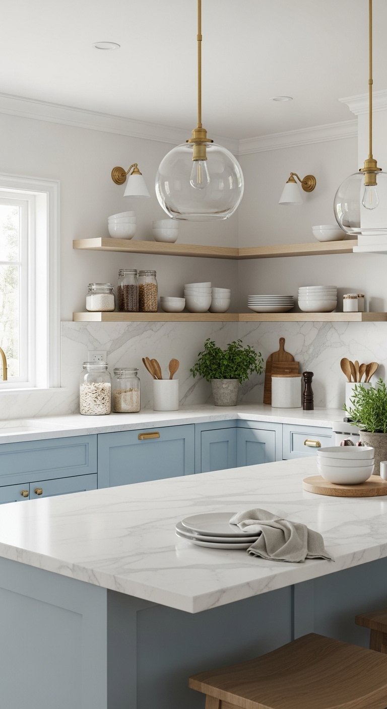 Use light blue kitchen cabinets to bring a soft ocean-inspired touch into your space. Choose shades like sky blue or pale aqua that feel calm instead of bold. This color works best on lower cabinets or a kitchen island while keeping upper cabinets white.Pair blue cabinets with white countertops and simple backsplashes to keep the look balanced. This contrast makes the blue stand out without overwhelming the room.Add glass jars, white dishes, and light wood accents to complete the look. These details make the kitchen feel fresh and lived-in.Lighting is important here. Use warm white lights to soften the blue tones and avoid a cold feel. Natural daylight will enhance the color even more.This idea creates a relaxing kitchen that feels like a peaceful day near the sea.