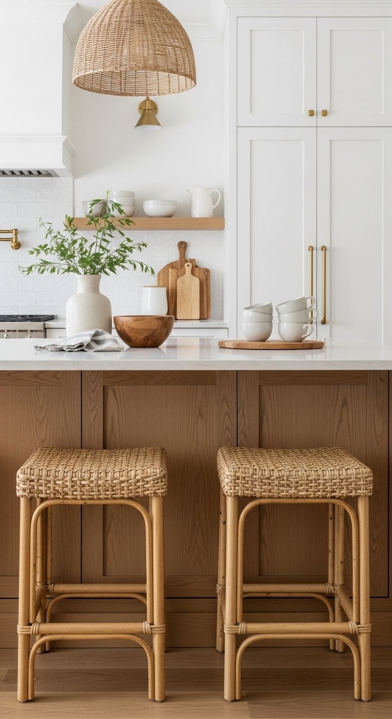 Add woven textures to create a soft and casual coastal feel. Materials like rattan, jute, and wicker work perfectly in this style.Use woven bar stools, pendant lights, or even storage baskets. These elements add depth and break the smooth surfaces of cabinets and counters.Choose light, natural tones instead of dark shades to keep the space bright. Mix textures carefully so the kitchen still feels clean.You can also add a jute runner rug for extra warmth and comfort. It makes the space feel lived-in without being messy.This idea adds a relaxed layer to your kitchen design. It feels comfortable and natural, like a breezy beach home.