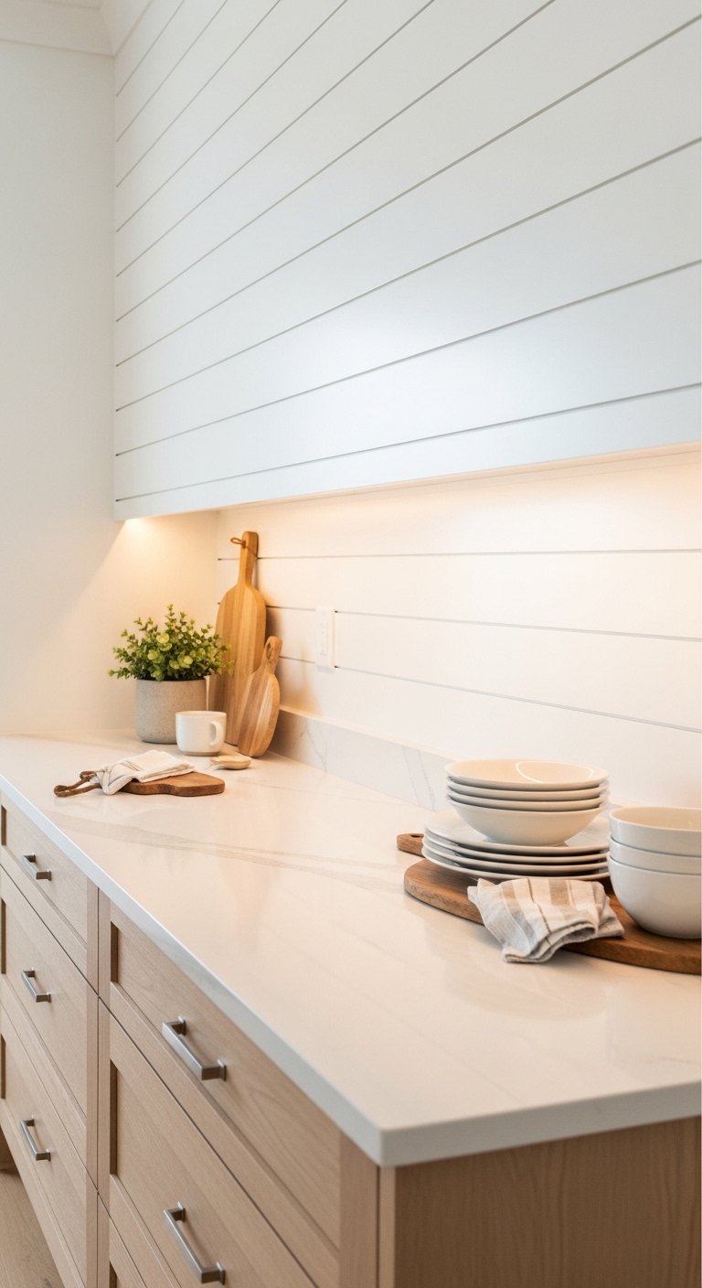 Install shiplap wall panels to give your kitchen a true coastal feel. These horizontal lines add texture without making the space busy.Paint the shiplap in crisp white or soft off-white for a clean and bright look. This helps reflect light and keeps the kitchen feeling open.You can use shiplap on a full wall, a backsplash area, or even the kitchen island. It works as a subtle background that adds depth.Pair it with simple decor like wooden accents and soft textiles to complete the style. Avoid heavy decorations so the texture can stand out.This idea brings a timeless beach house charm into your kitchen. It feels simple, fresh, and easy to maintain.